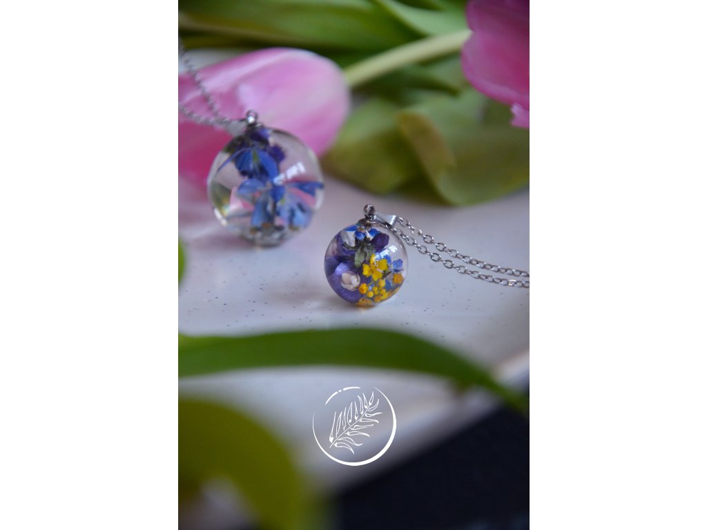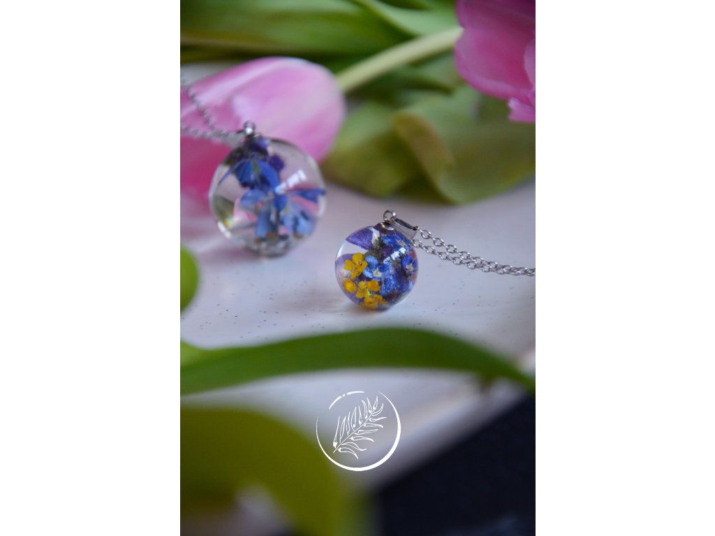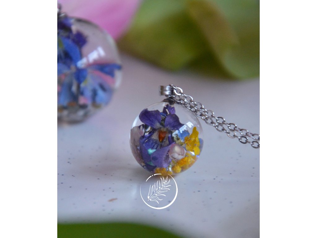Pestrobarevná kulička s fialkou, pomněnkami, žlutou tařicí a růžovým ozothamnem. Průměr kuličky 1,8 cm. Veškteré komponenty jsou z chirurgické oceli.