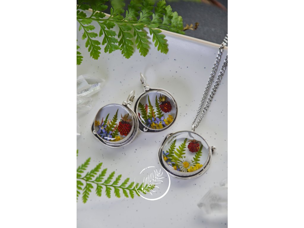 Letní barevný přívěsek s lesními jahodami, sedmikráskou, kapradinami, žlutou tařicí a pomněnkou. Lůžko je z postříbřeně mosazi, řetízek z chirurgické oceli.