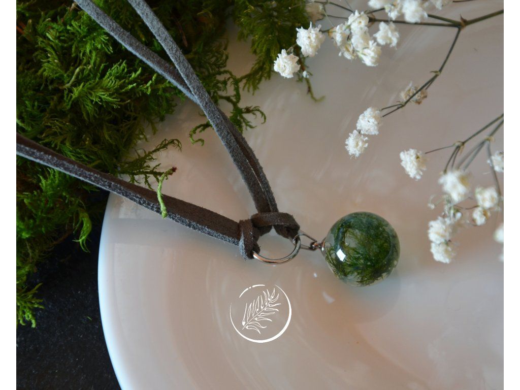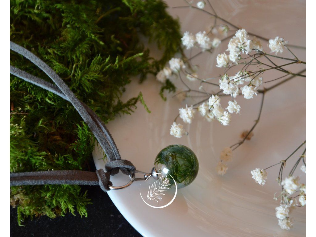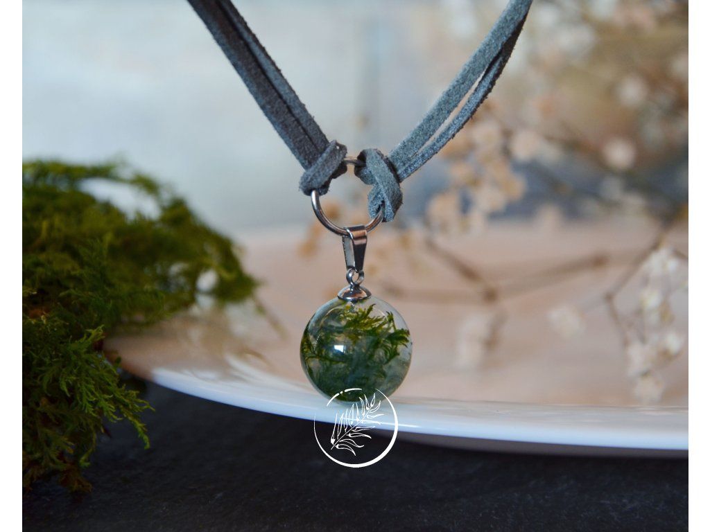 Náhrdelník s mléčně kapkou (průměr 1,7 cm), která v sobě ukrývá pravý mech a připomíná tak mechový achát. Zavěšena je na syntetické kůžičce v šedém odstínu. Věškeré komponenty jsou z chirurgické oceli. Aby choker seděl přesně na váš krk, do poznámky mi můžete napsat, jak dlouhý si přejete náhrdelník udělat (v cm) a já přidám kůžičce zapínání tak, aby vám přesně seděl na míru.