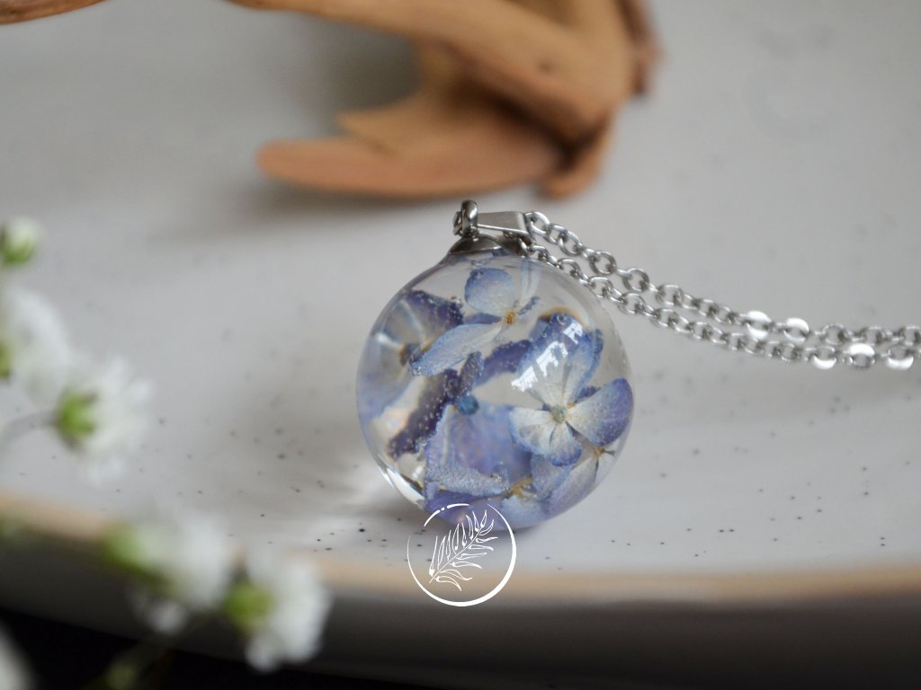 Náhrdelník ve tvaru kuličky s modrými květy hortenzií. Veškeré komponenty jsou z chirurgické oceli, průměr kuličky 25 mm.
