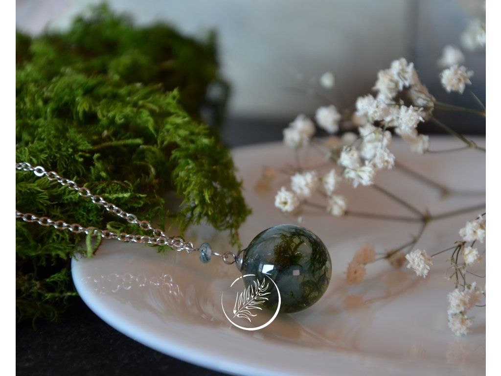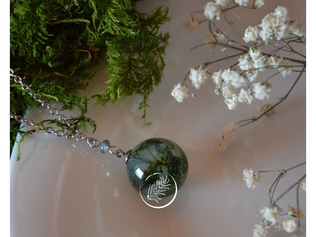 Náhrdelník s mléčně bílou kuličkou (průměr 2 cm), která v sobě ukrývá pravý mech a připomíná tak mechový achát. Doplněna je o minerální korálek z mechového achátu. Veškeré komponenty jsou z chirurgické oceli. Délka řetízku je 46 cm.