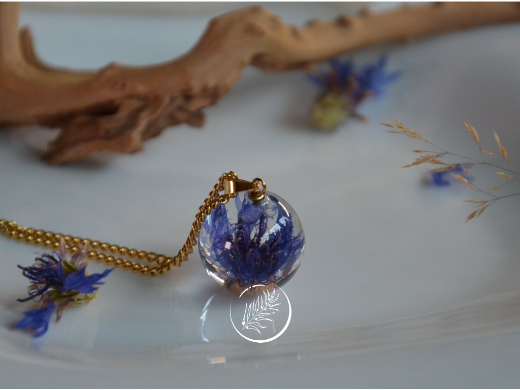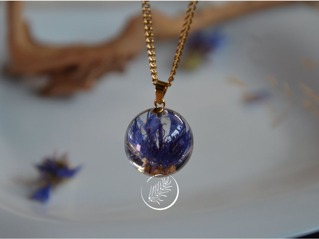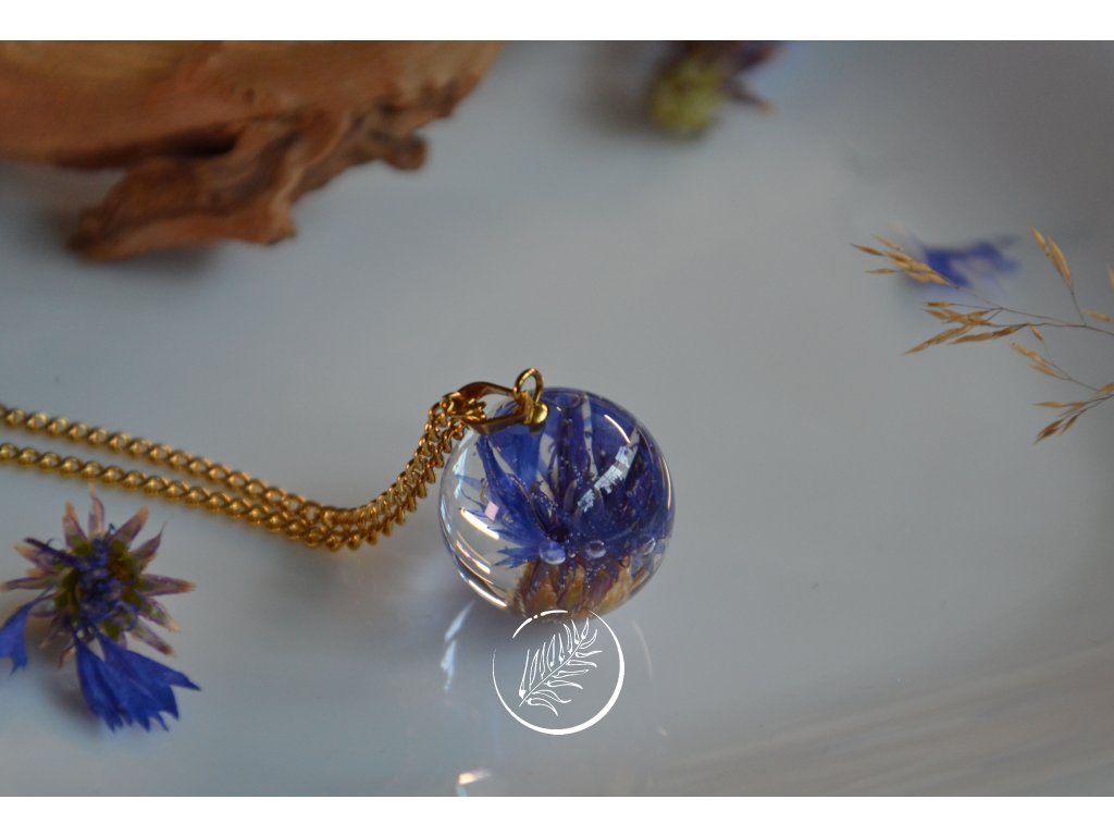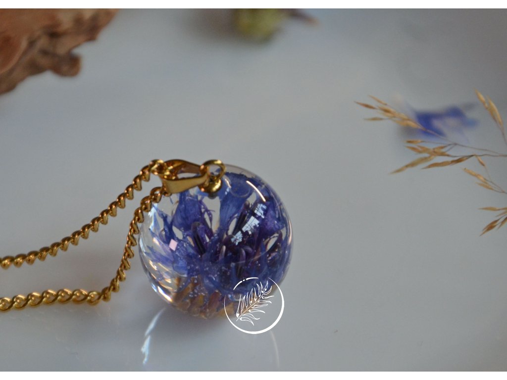 Přívěsek ve tvaru kuličky s květem chrpy. Průměr kuličky 2 cm, veškteré komponenty jsou z chirurgické oceli se zlatou galvanizací.