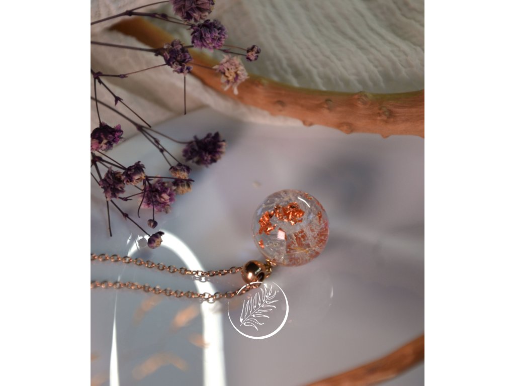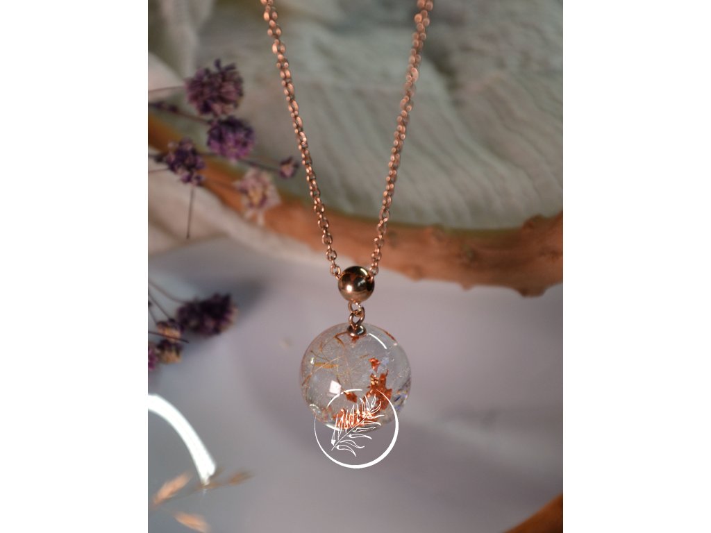 Přívěsek ve tvaru kuličky s pampeliškovým chmýřím a šupinkami v odstínu růžového zlata. Průměr kuličky 1,8 cm, veškeré komponenty jsou z chirurgické oceli s rose gold galvanizací.