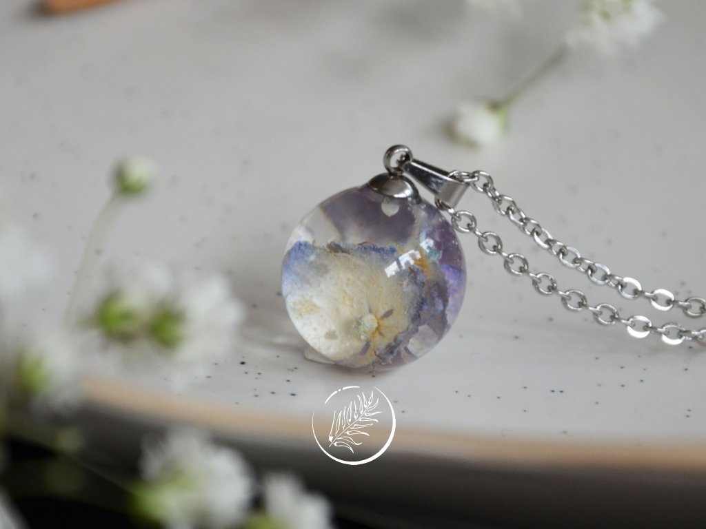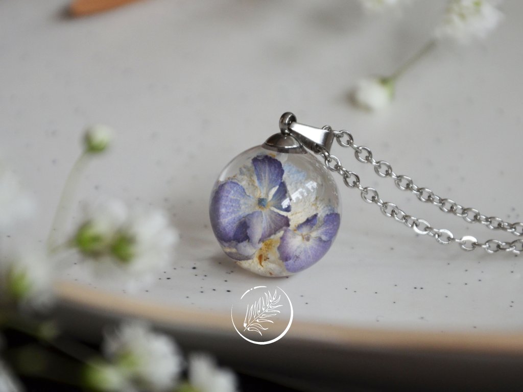 Náhrdelník ve tvaru kuličky s modrými a fialovými květy hortenzií. Veškeré komponenty jsou z chirurgické oceli, průměr kuličky 18 mm.