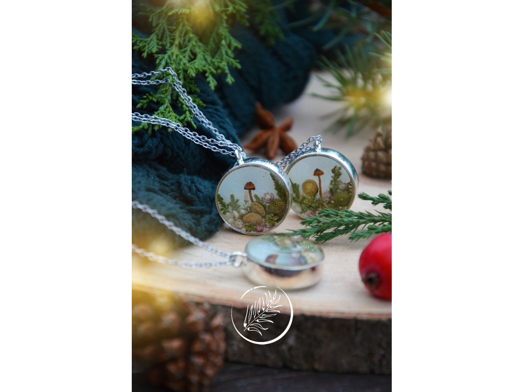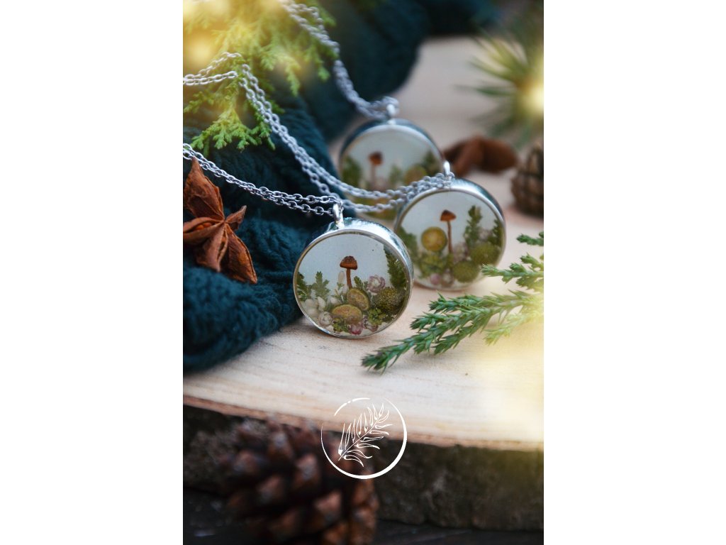 Medailonek s pravou houbičkou, plátky maličké nezralé mandarinky, bílým vřesem, růžovým ozothamnem a zelenou šištičkou brunie. Řetízek z chirurgické oceli.