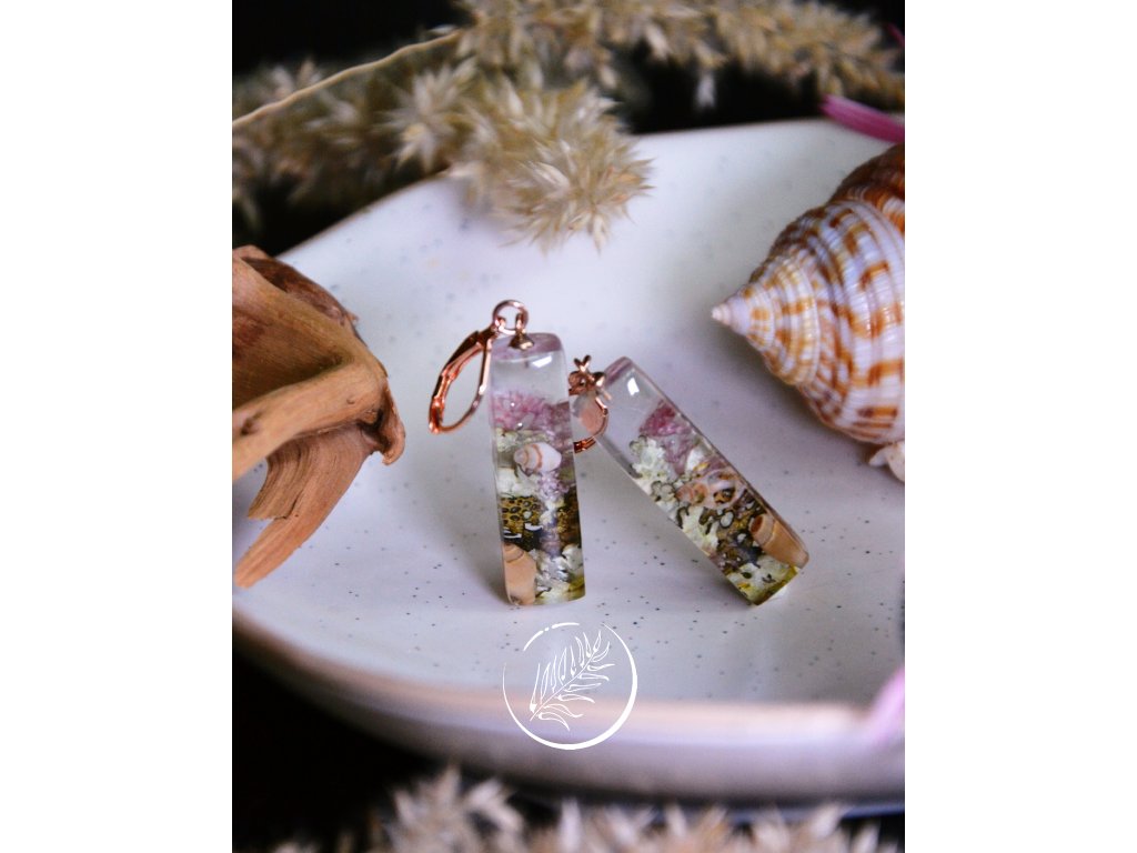 Mořské visací náušnice s pravými schránkami mořských měkkýšů a mnoha druhy lišejníků imitující korály. Veškeré komponenty jsou z chirurgické oceli s rose gold galvanizací. Délka náušnic bez zapínání 35 mm.