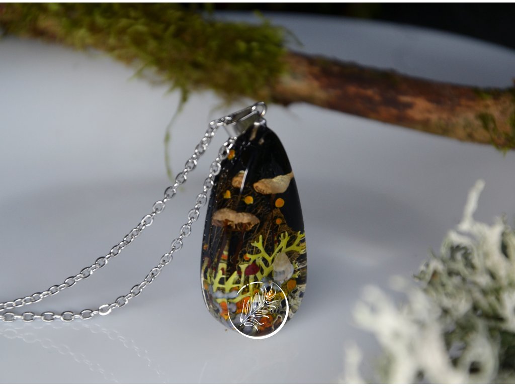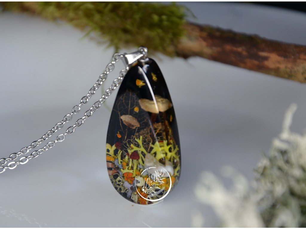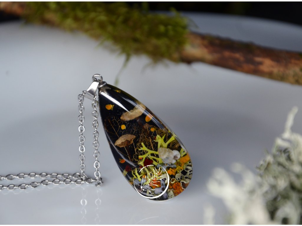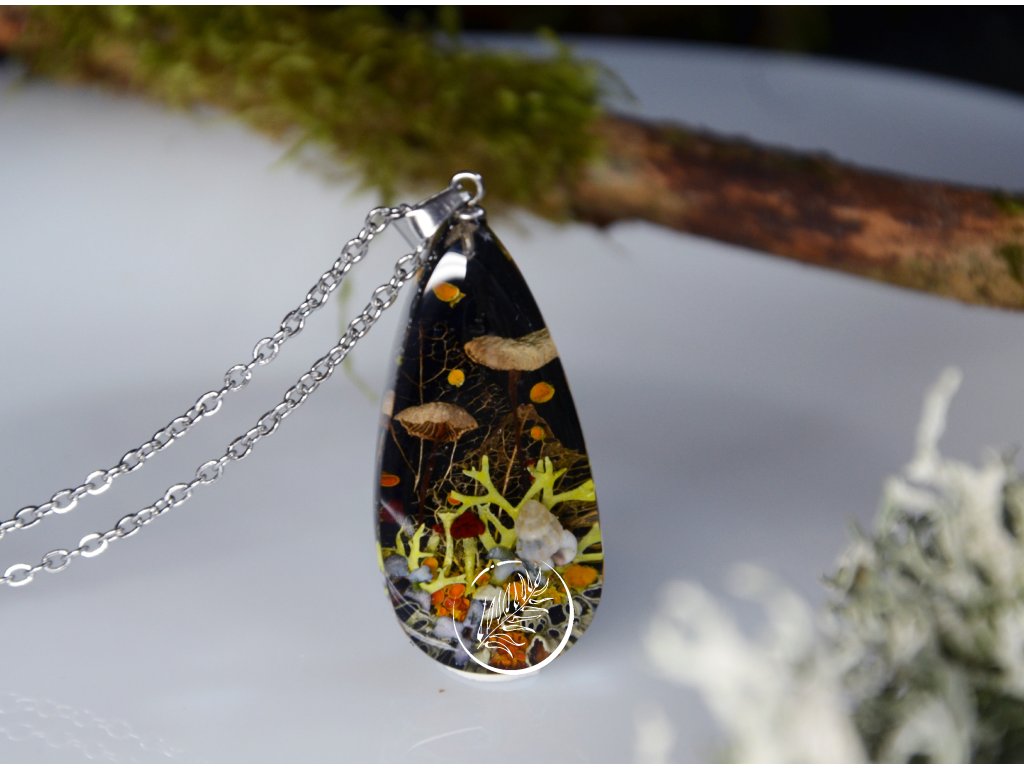 Přívěsek ve tvaru kapky s houbičkami, skeletovaným listem hortenzie, ulitou, fialovými květy motýlího keře a pestrobarevnými lišejníky na černém pozadí. Délka kapky 39 mm. Veškeré komponenty jsou z chirurgické oceli.