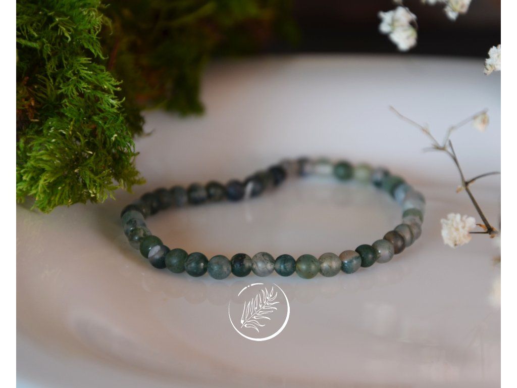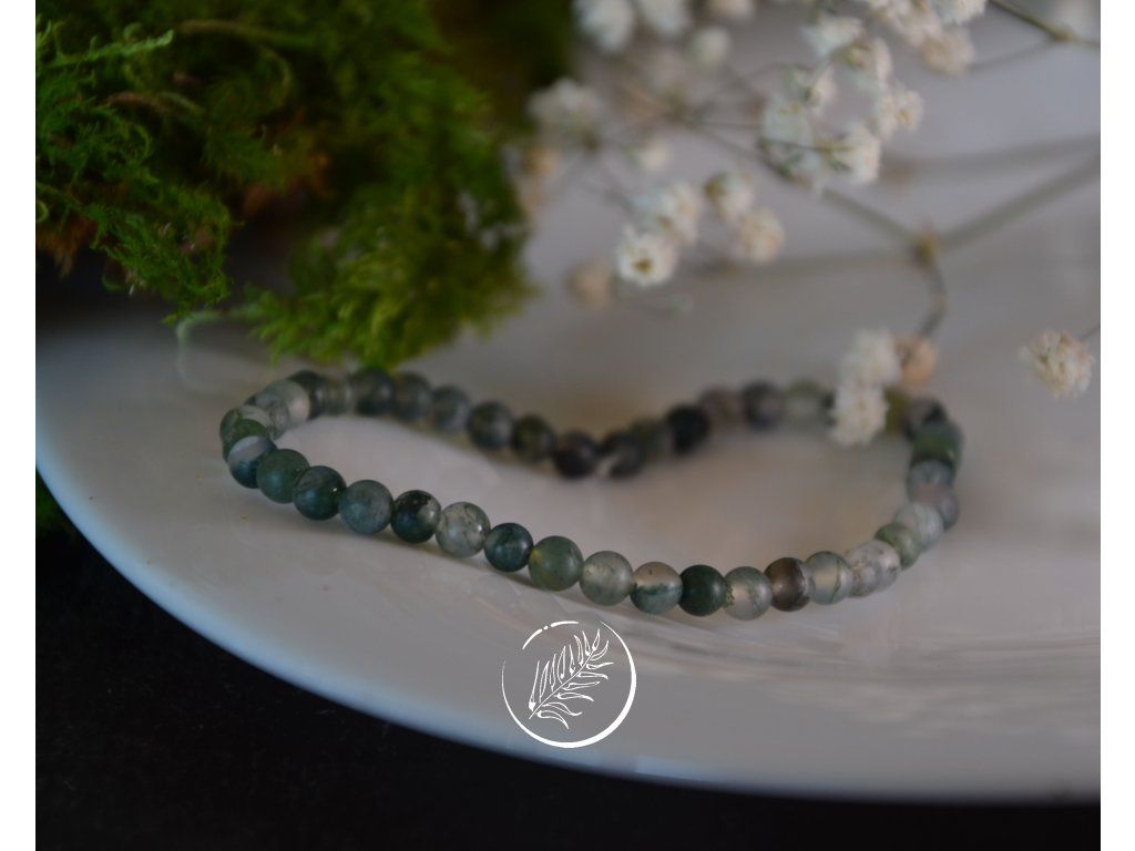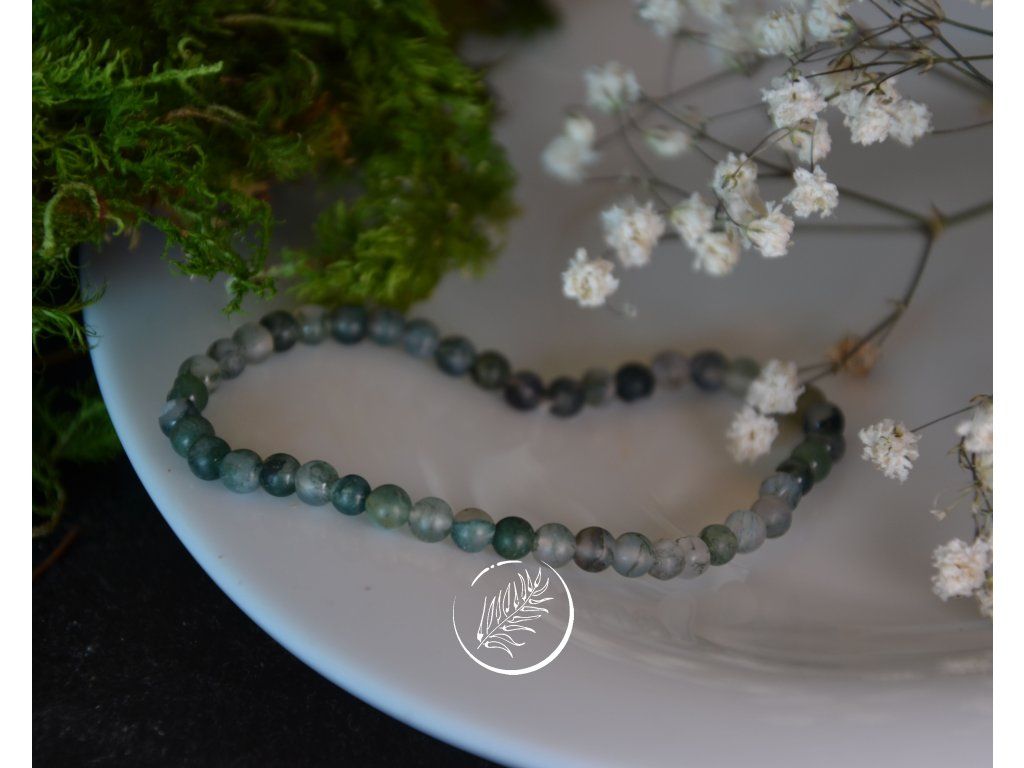 Náramek z mineálních korálků z mechového achátů ve tvaru menších kuliček (průměr 4 mm). Obvod náramku je 18 cm, ale je velmi pružný a přizpůsobí se téměř každému zápěstí.