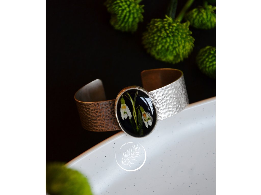 Náramek se sněženkami na černém pozadí. Postříbřená mosaz. Průměr lůžka 22 mm. Velikost lehce nastavitelná roztažením/stažením.