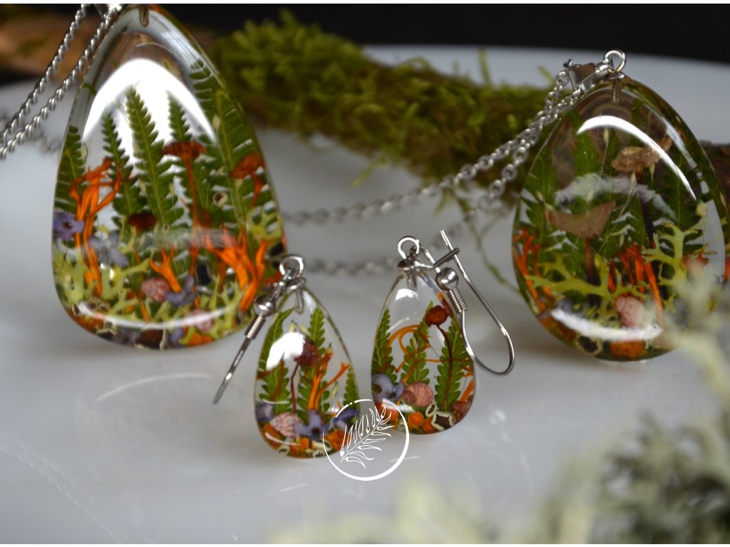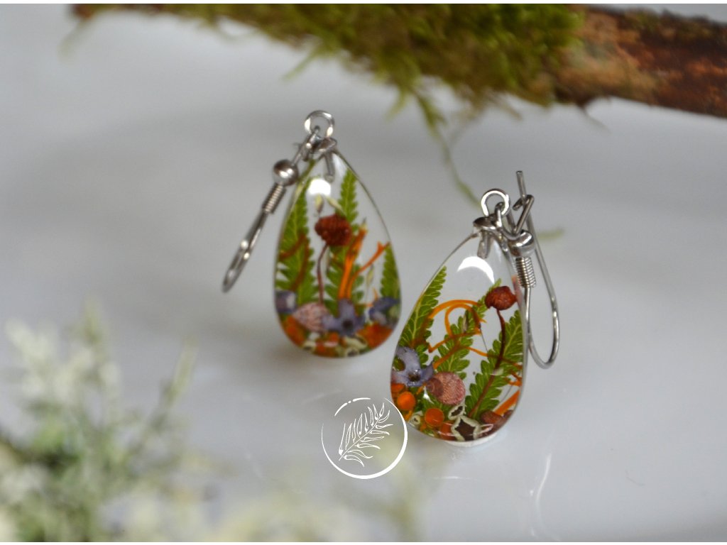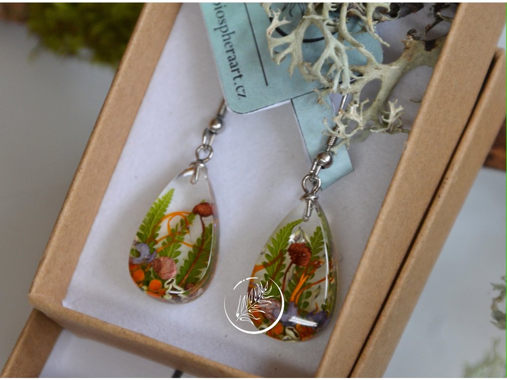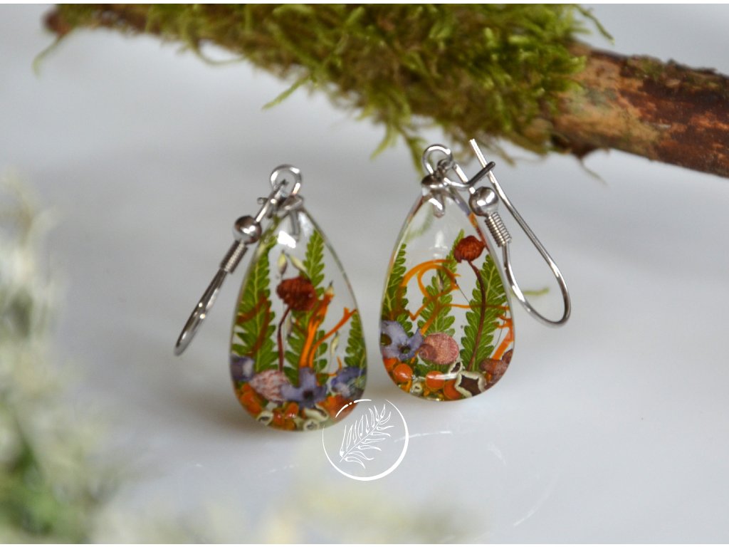 Přívěsek ve tvaru kapky s houbičkami, oranžovým krásnorůžkem lepkavým, kapradím, růžovobílou ulitou, fialovými květy motýlího keře a pestrobarevnými lišejníky. Délka kapky 21 mm. Veškteré komponenty jsou z chirurgické oceli.