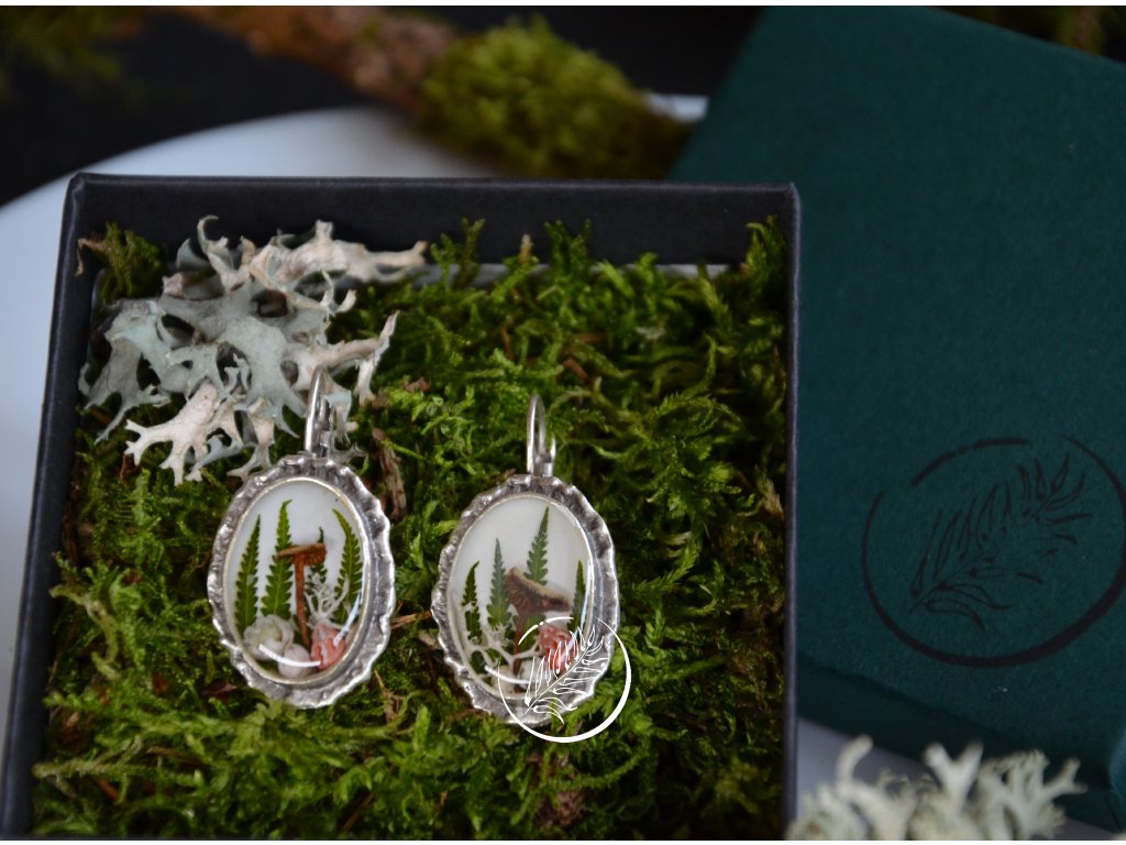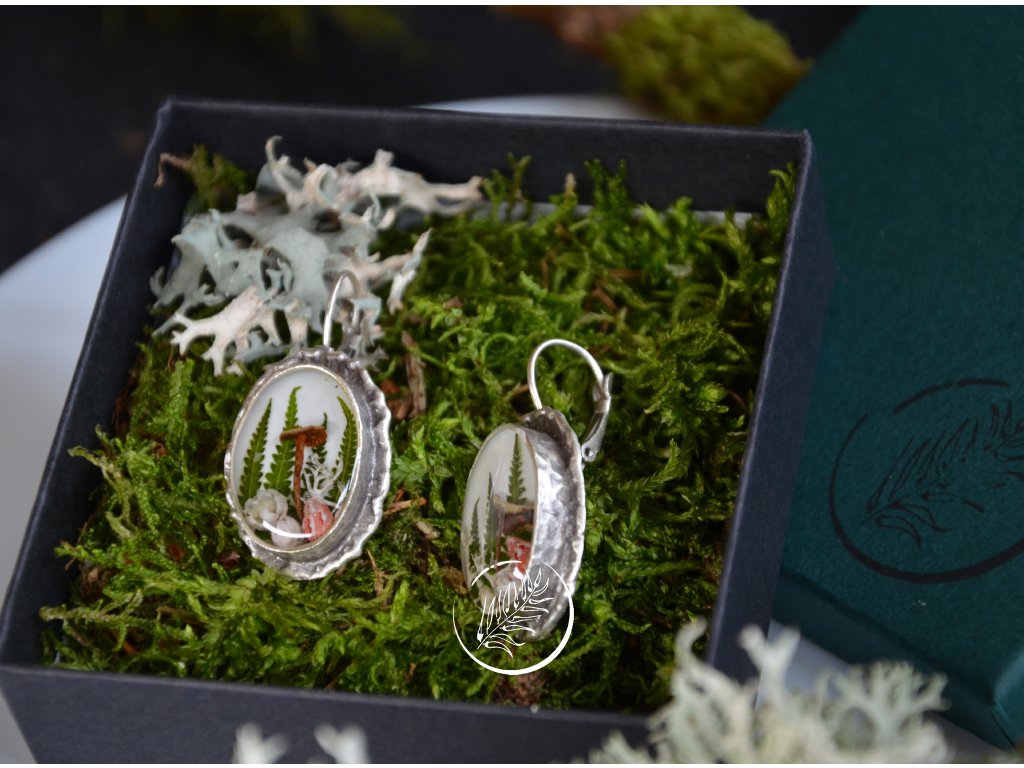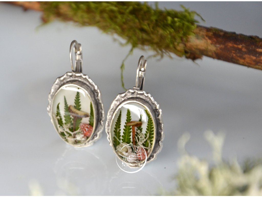 Oválné visací náušnice s pravými houbičkami, kapradím, růžovobílou ulitou, bílým lišejníkem a bílými květy ozothamnu. Rozměry oválku 20 x 15 mm. Postříbřená mosaz.