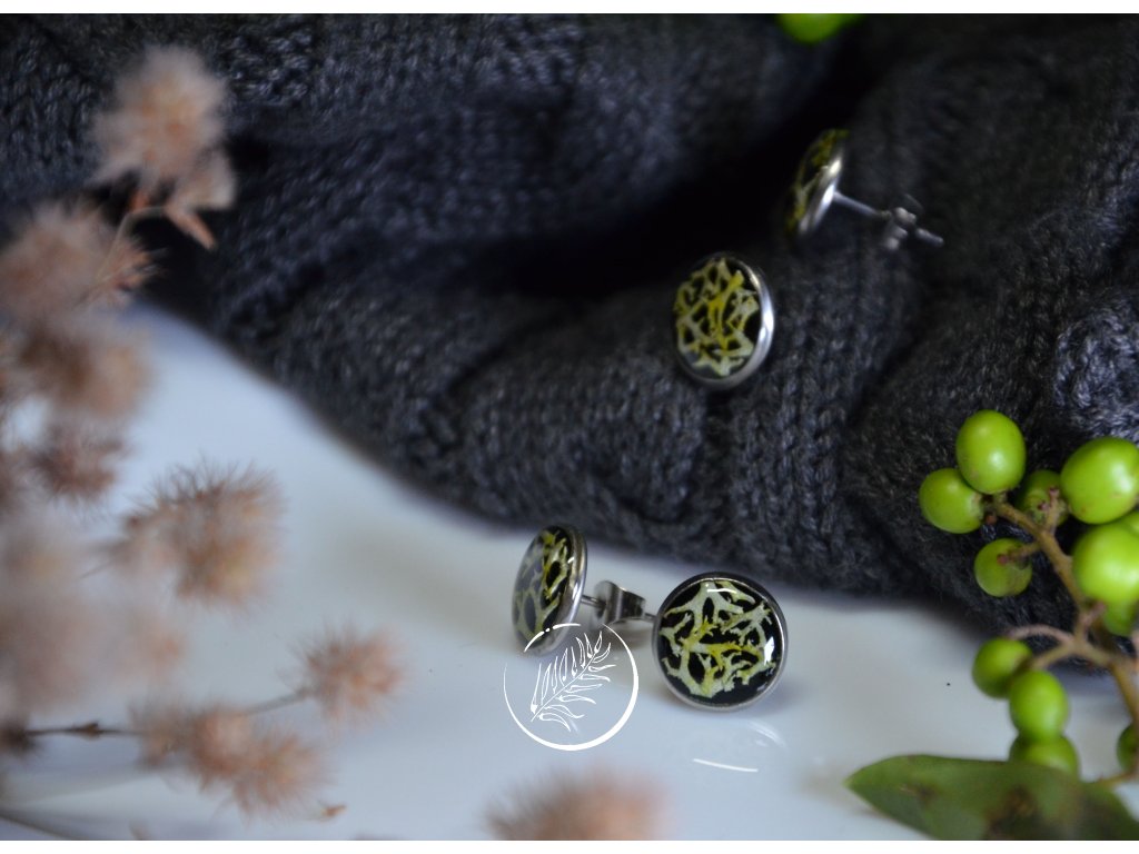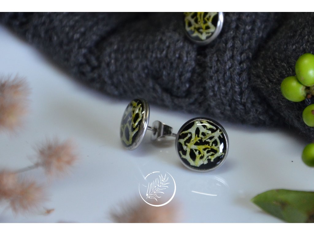 Puzetky do uší s lišejníkem terčovkou na černém pozadí. Průměr 10 mm, chirurgická ocel.