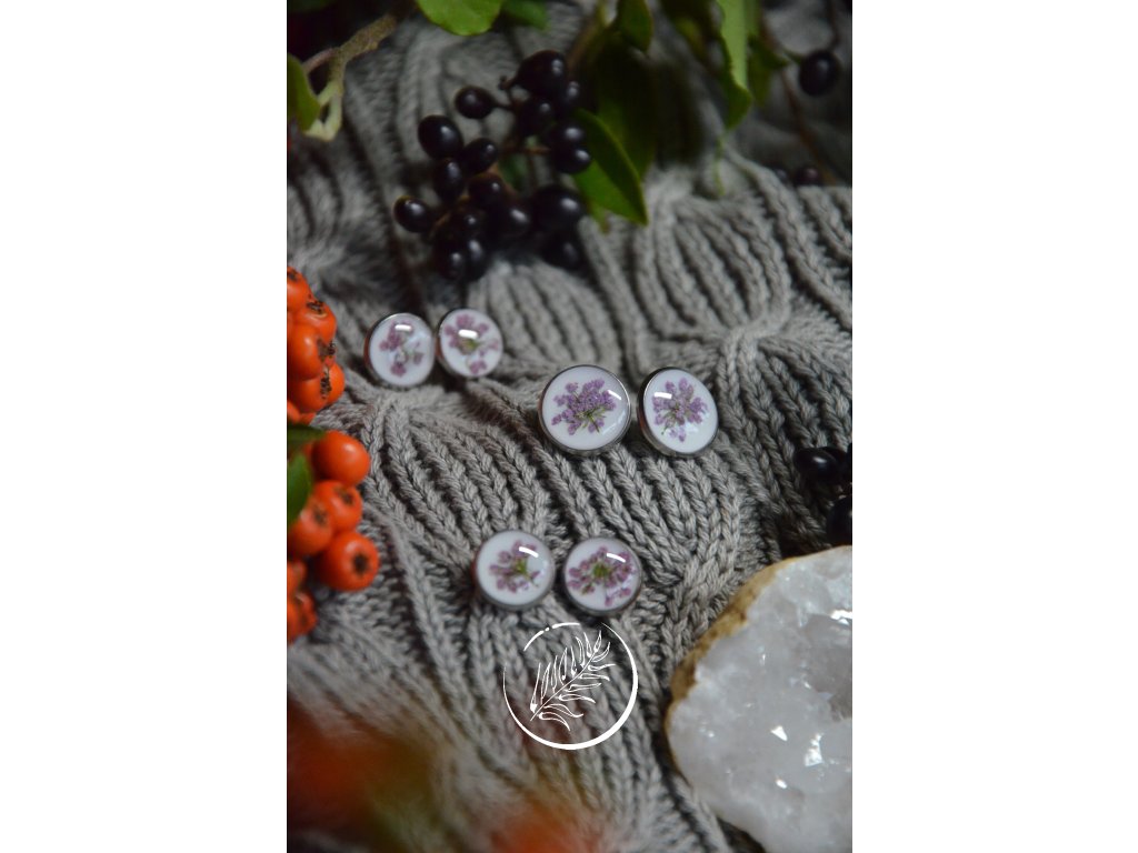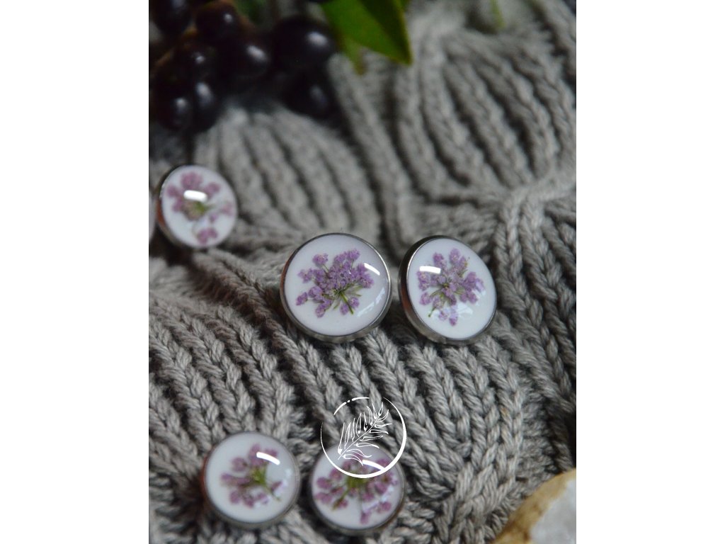 Puzetky do uší s růžovofialovým květem kerblíku na bílém pozadí. Průměr 12mm, chirurgická ocel.