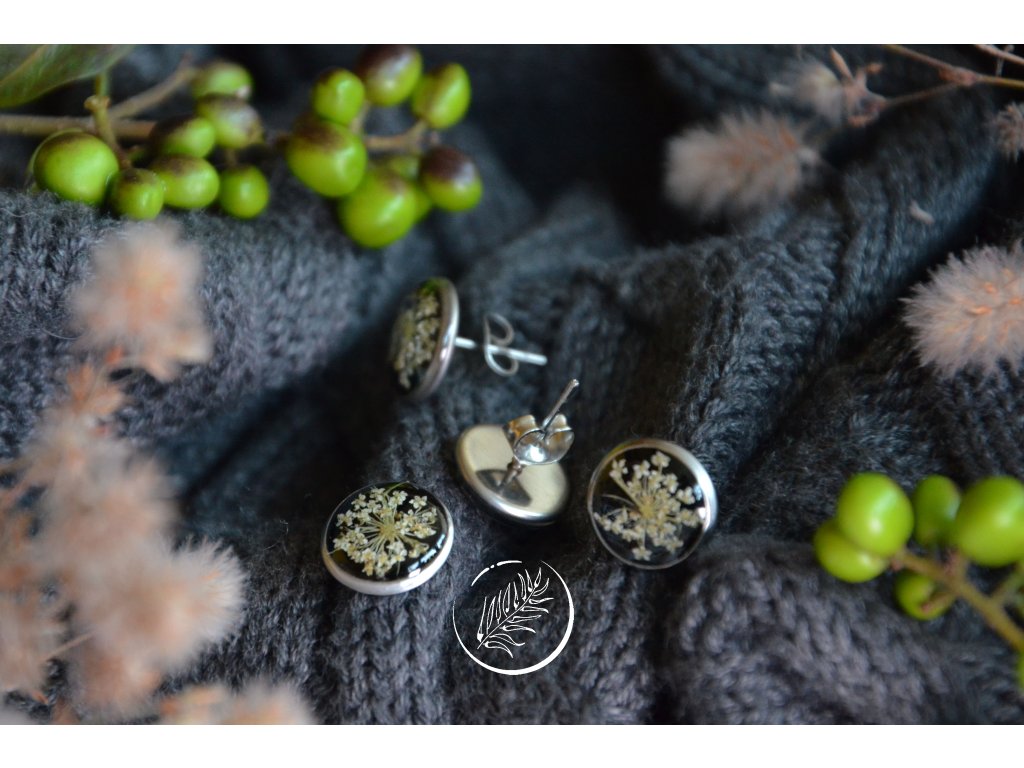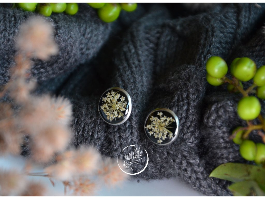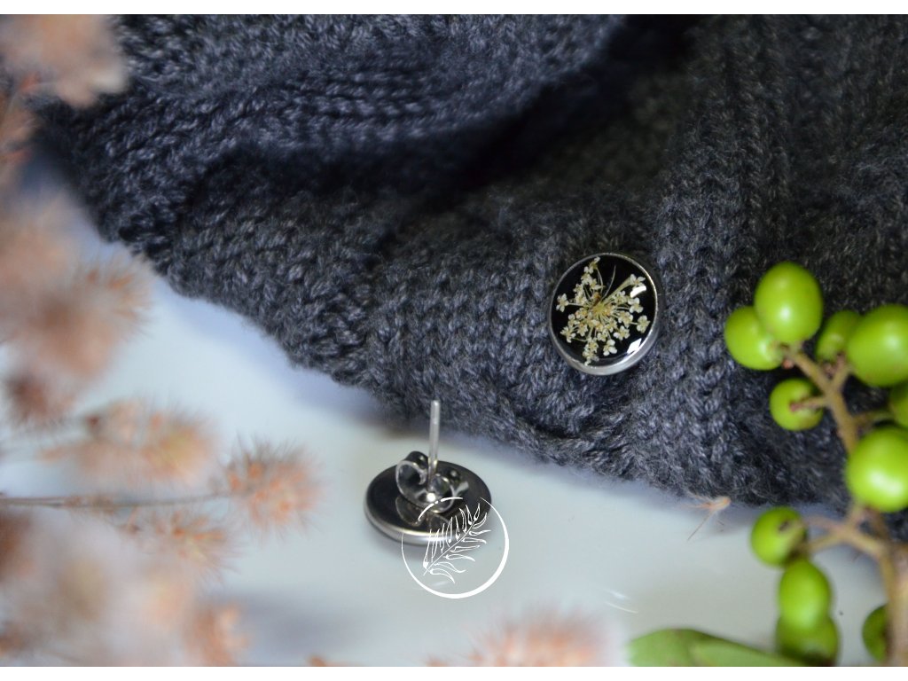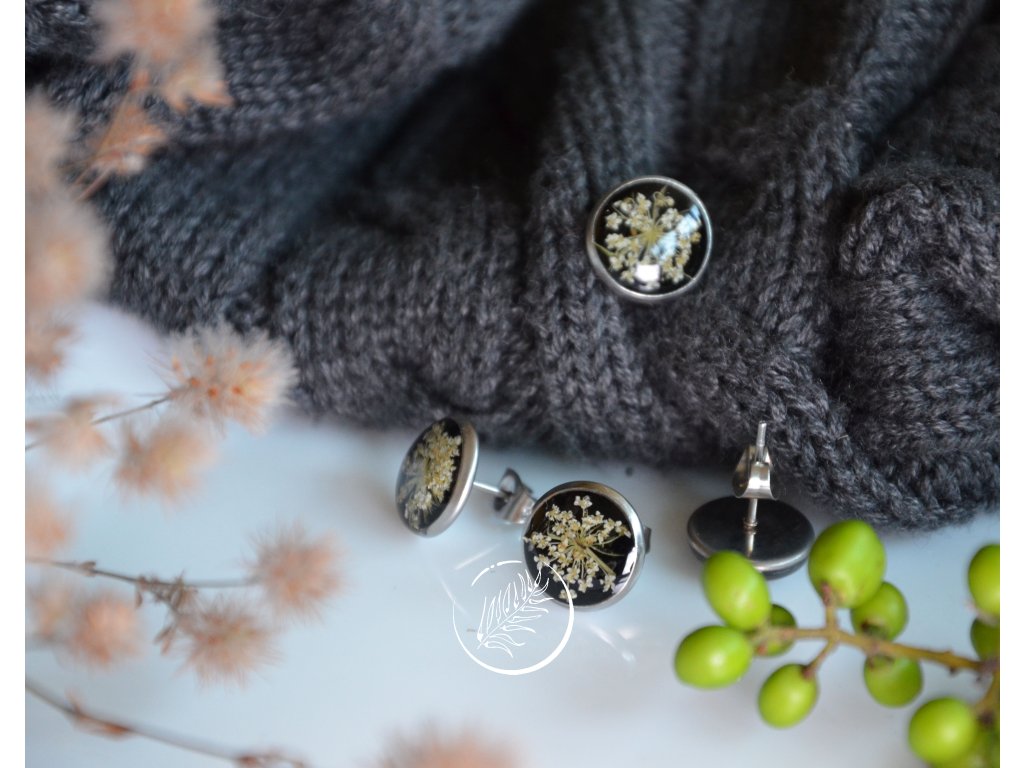 Puzetky do uší s bílým květem kerblíku na černém pozadí. Průměr 10 mm, chirurgická ocel.