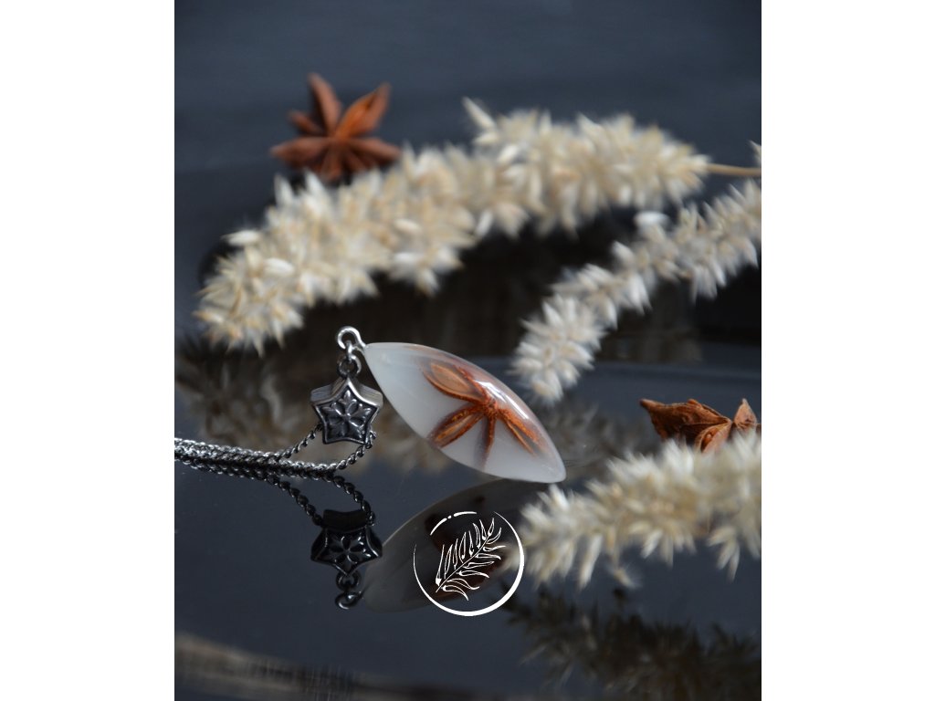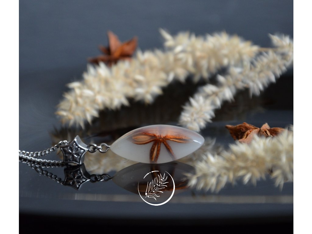 Náhrdelník s badyánem na mléčně bílém pozadí. Veškeré komponenty jsou z chirurgické oceli.