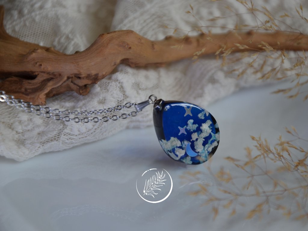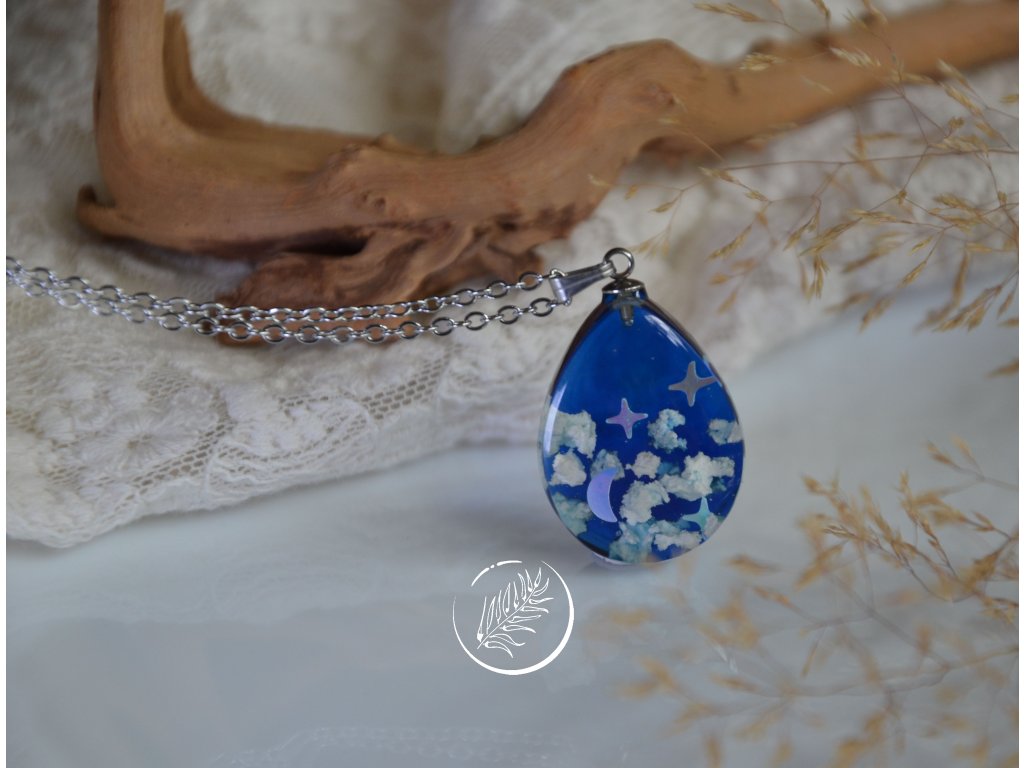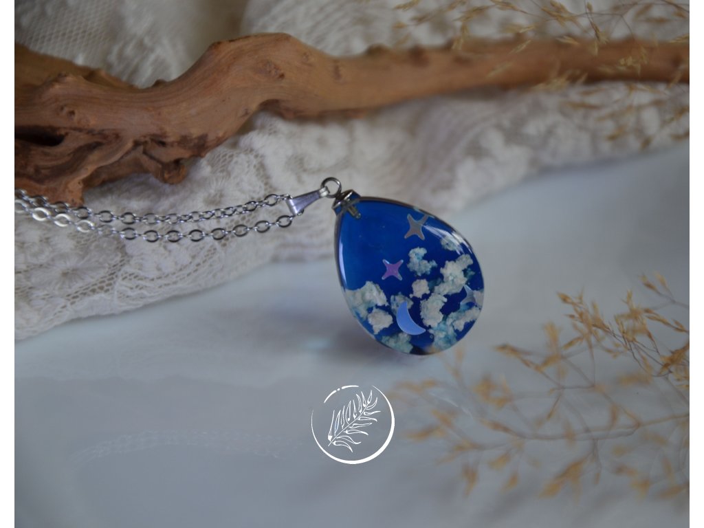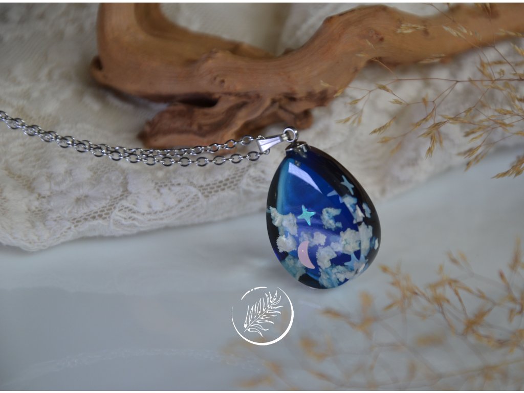 Přívěsek ve tvaru kapky s noční oblohou. Veškeré komponenty jsou z chirurgické oceli.