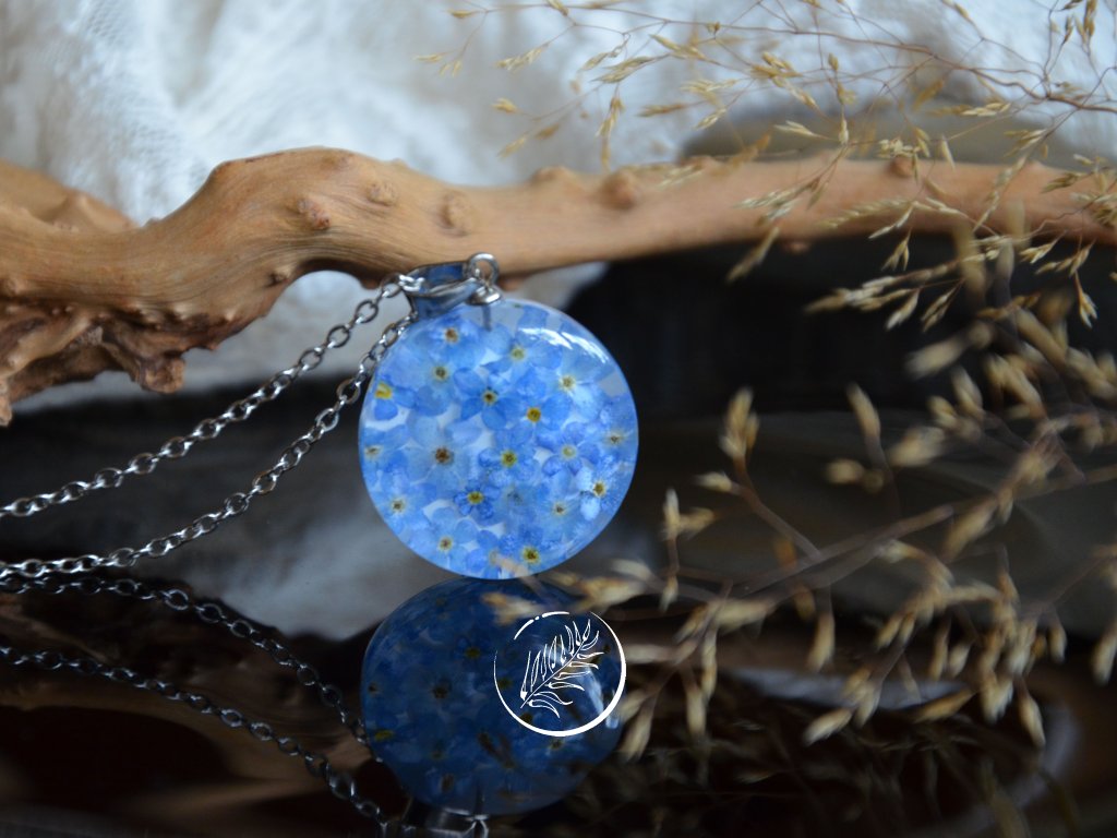 Přívěsek s pomněnkami na bílém pozadí. Veškeré komponenty jsou z chirurgické oceli.