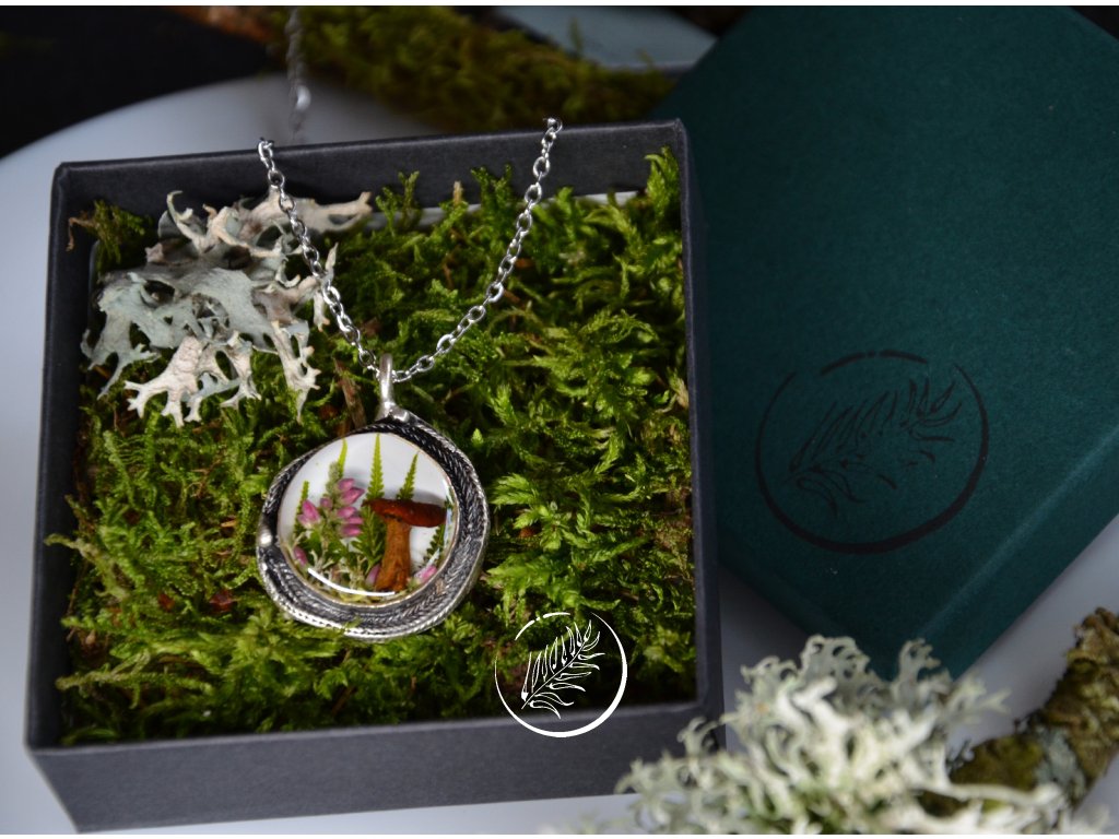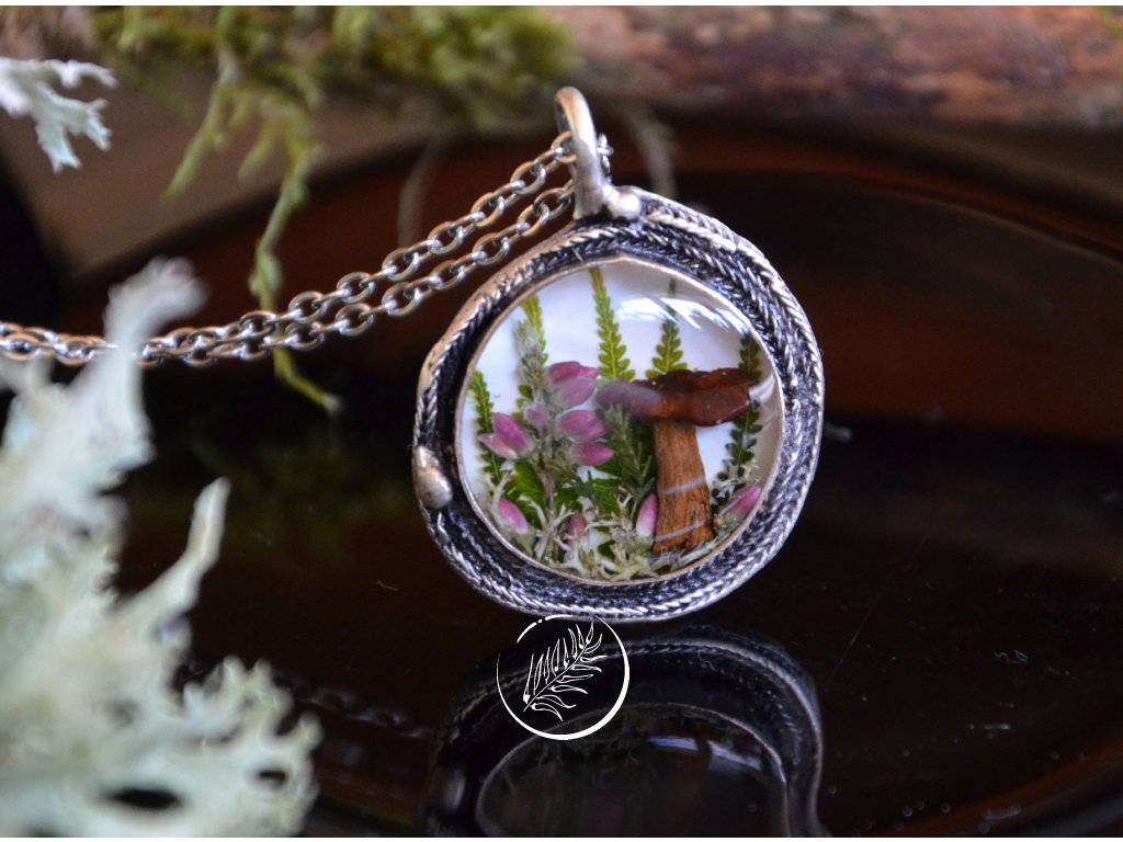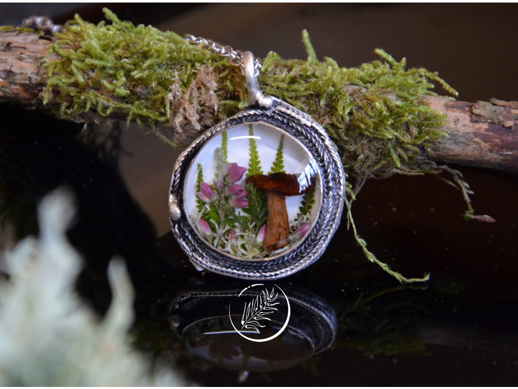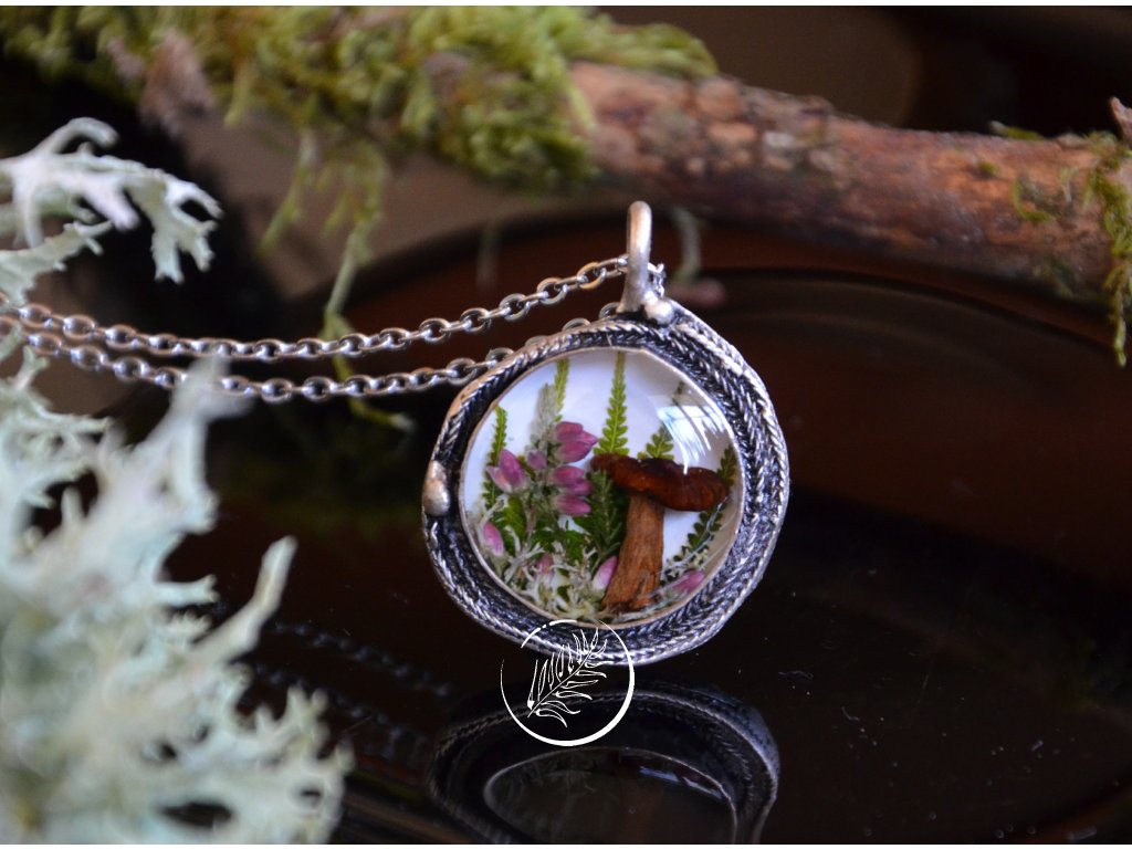 Náhrdelník s houbičkou, kapradím, vřesem a lišejníkem. Průměr lůžka 20 mm. Lůžko z postříbřené mosazi, řetízek z chirurgické oceli.