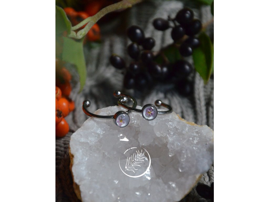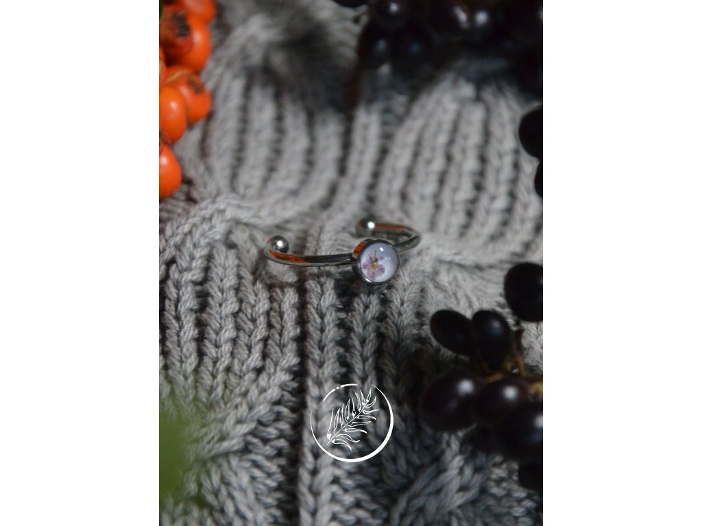 Drobný prstýnek s růžovofialovým květem kerblíku na bílém pozadí. Nastavitelná velikost, chirurgická ocel.