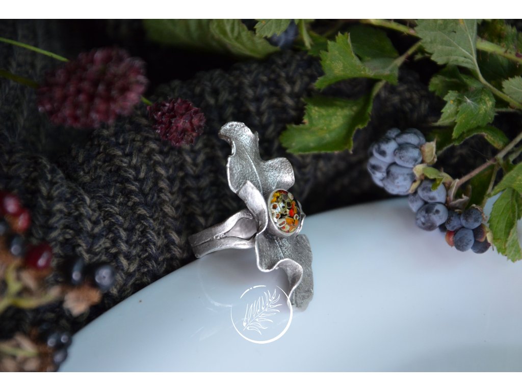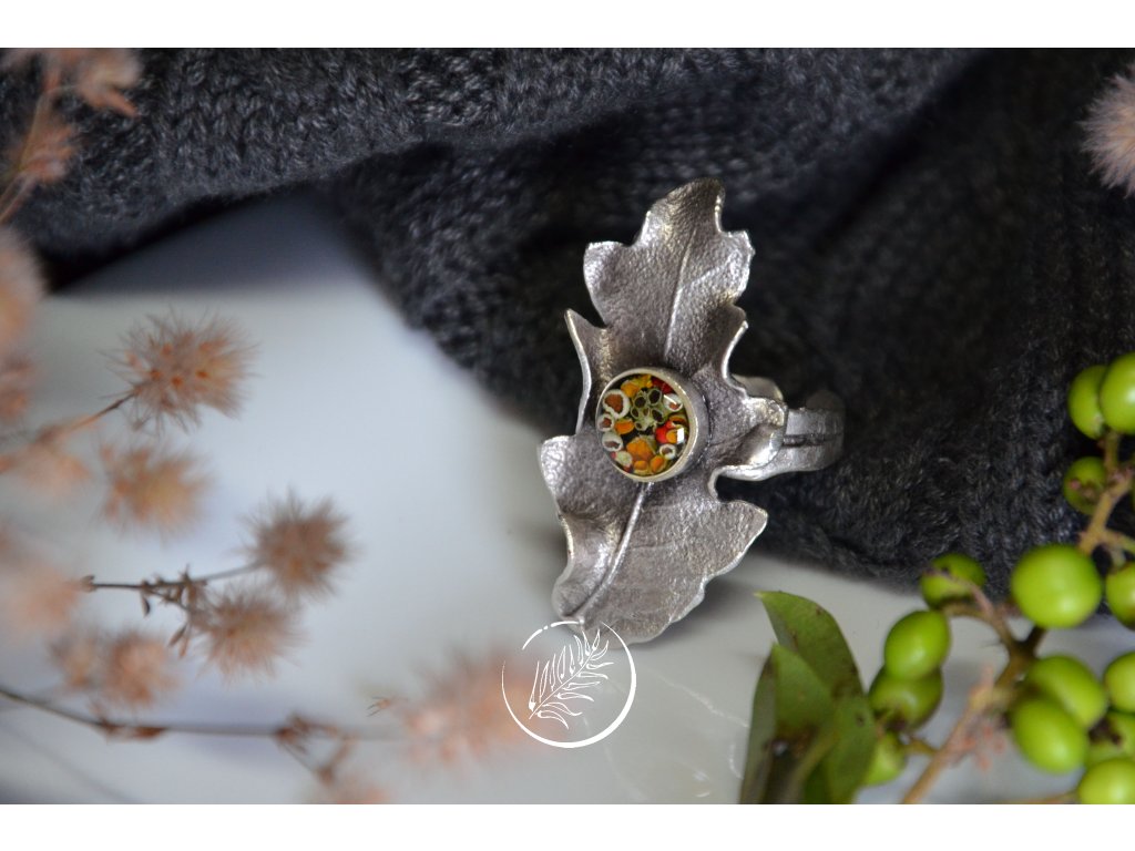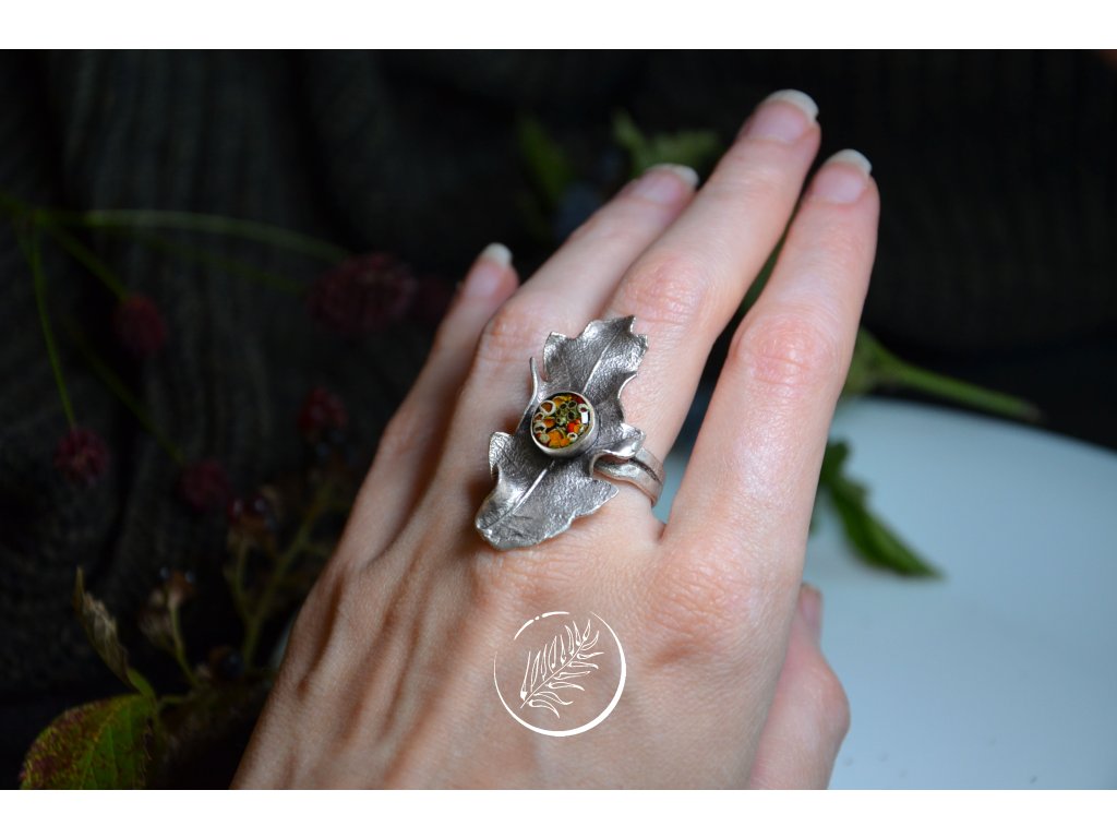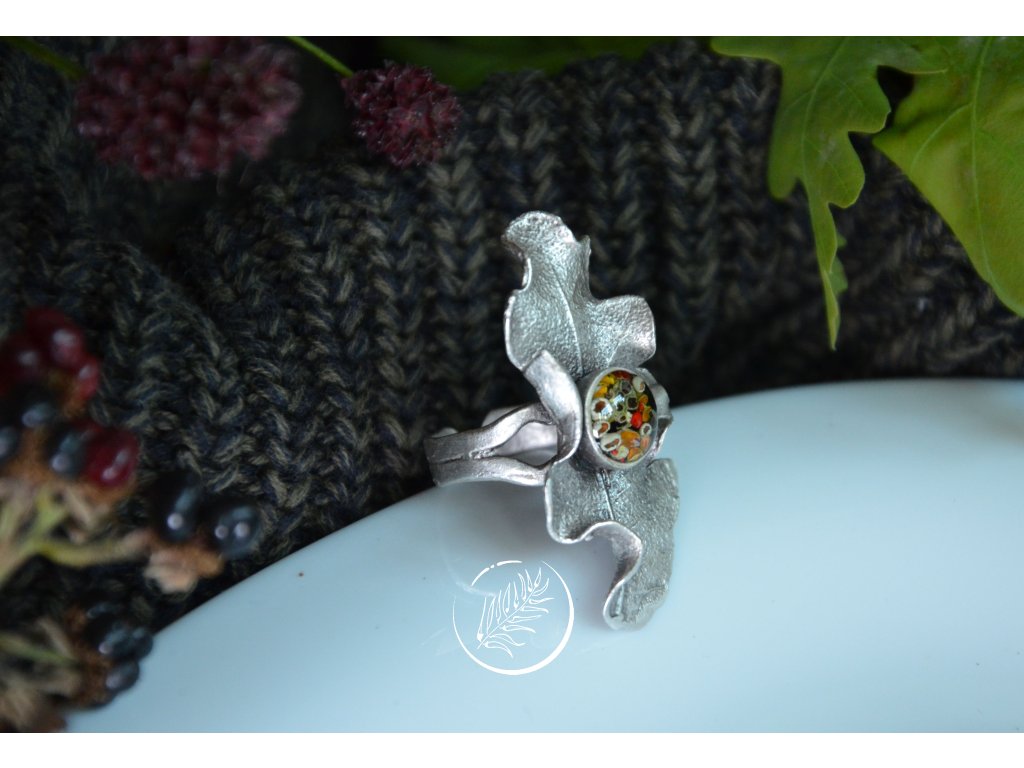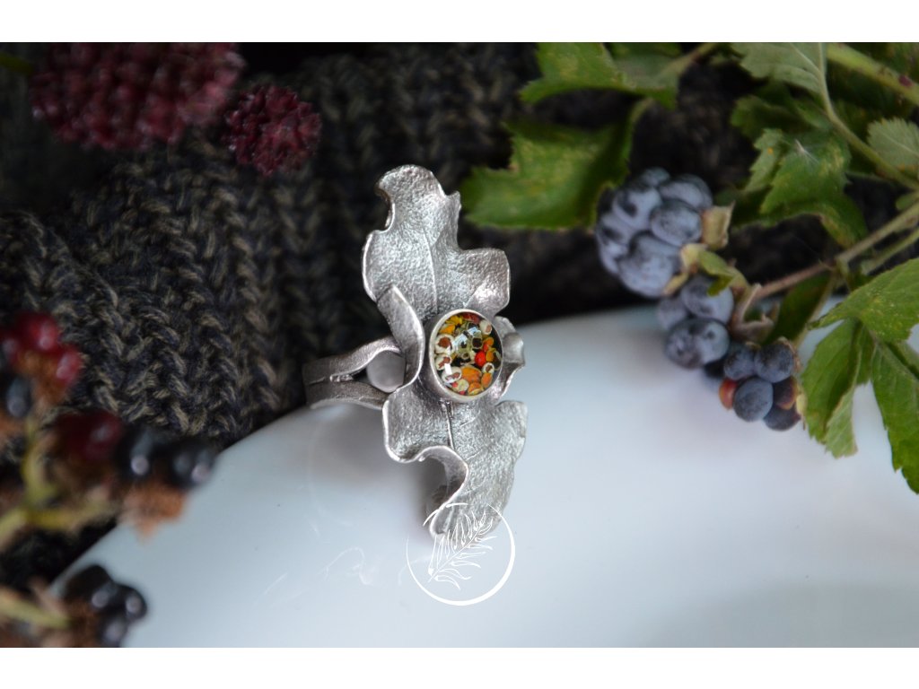 Prstýnek ve tvaru dubového listu s pestrobarevnými lišejníky. Nastavitelná velikost, postříbřená mosaz. Velikost lišejníkového lůžka 8 mm.