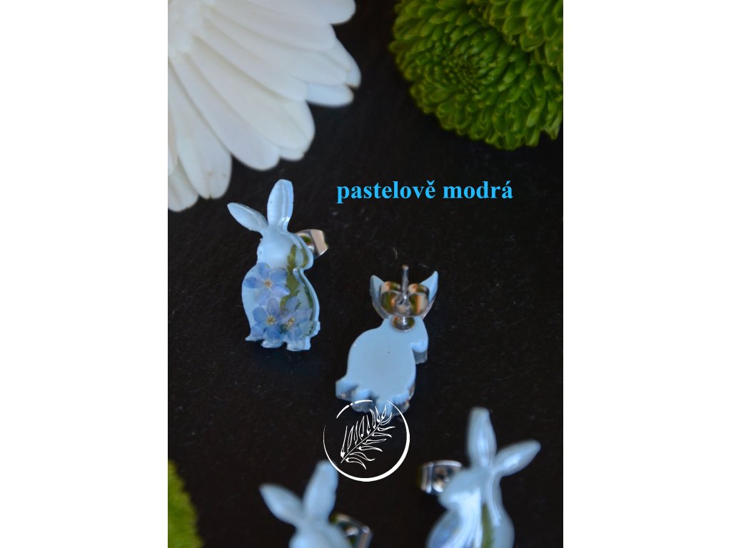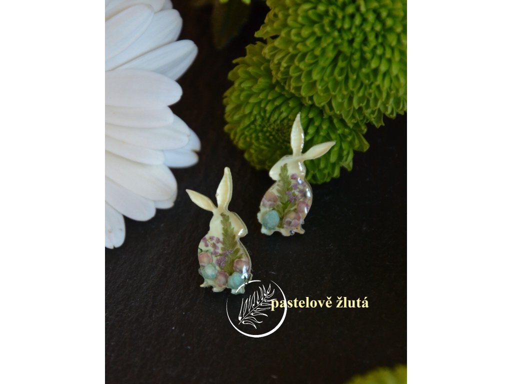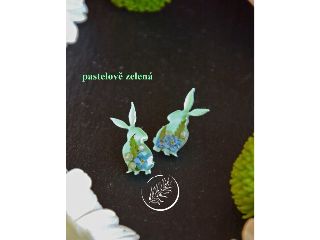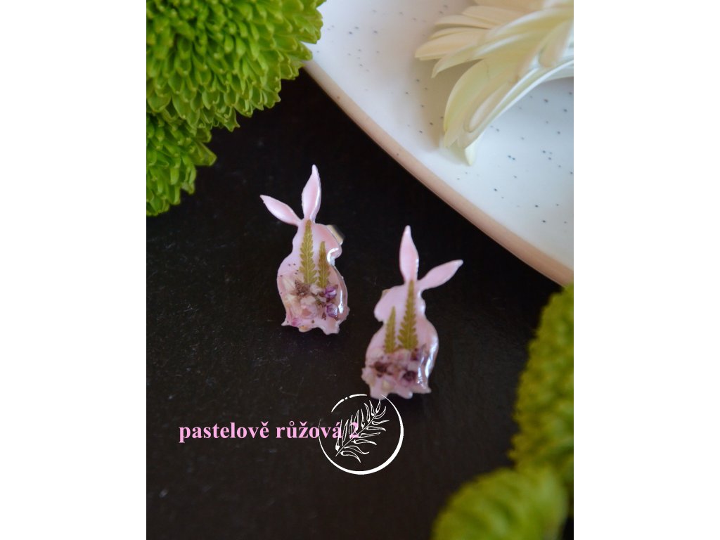 Pastelové pecky do uší ve tvaru zajíčka s kapradinami, pomněnkami a ozothamnem. Výběr z mnoha odstínů, do poznámky prosím uveďte požadovanou barvu. Zapínání z chirurgické oceli.