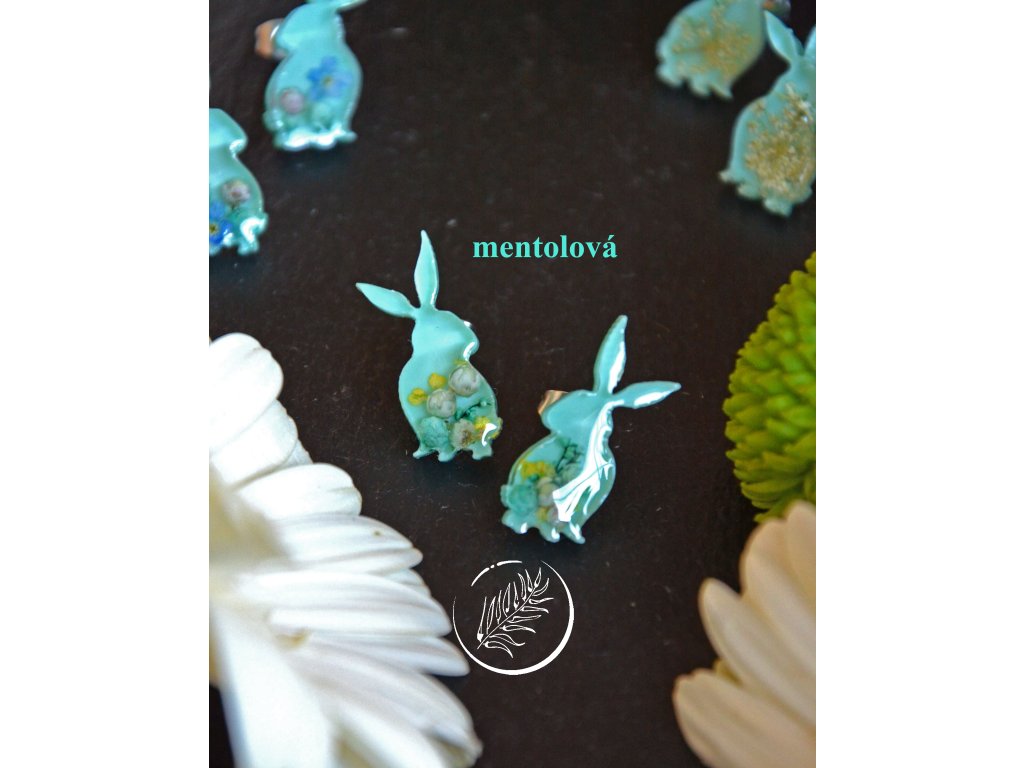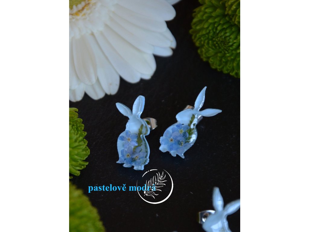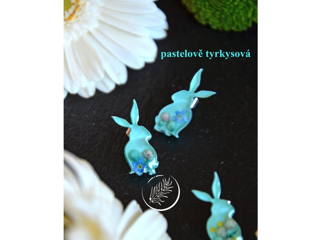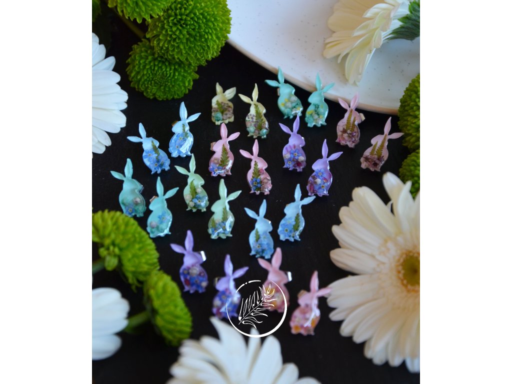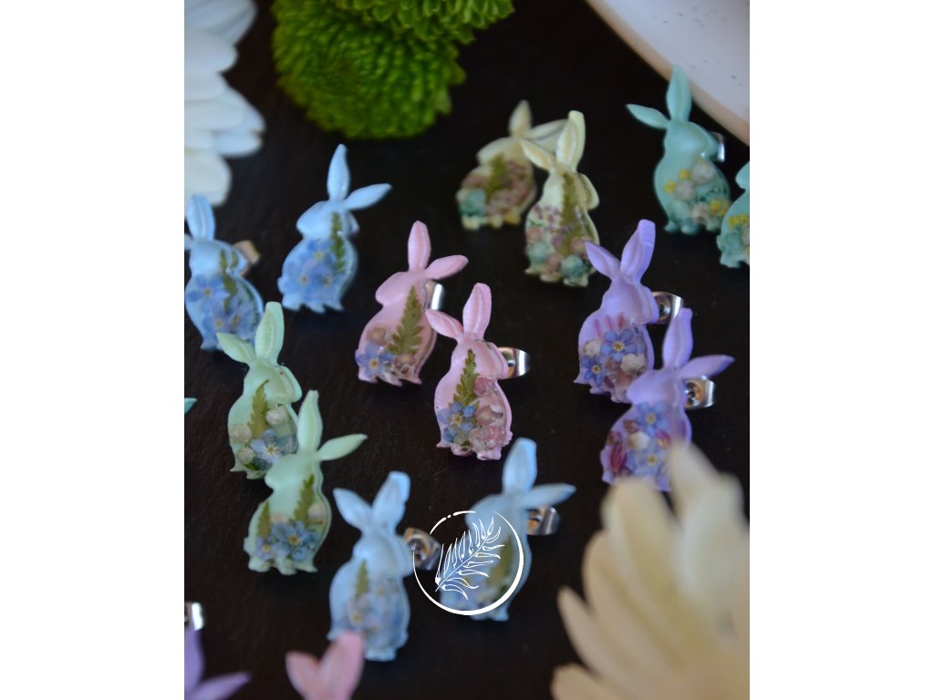 Pastelové pecky do uší ve tvaru zajíčka s kapradinami, pomněnkami a ozothamnem. Výběr z mnoha odstínů, do poznámky prosím uveďte požadovanou barvu. Zapínání z chirurgické oceli.