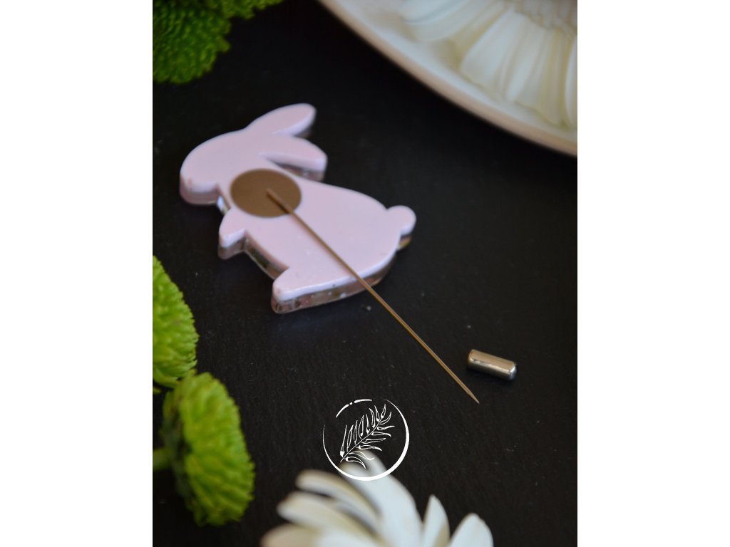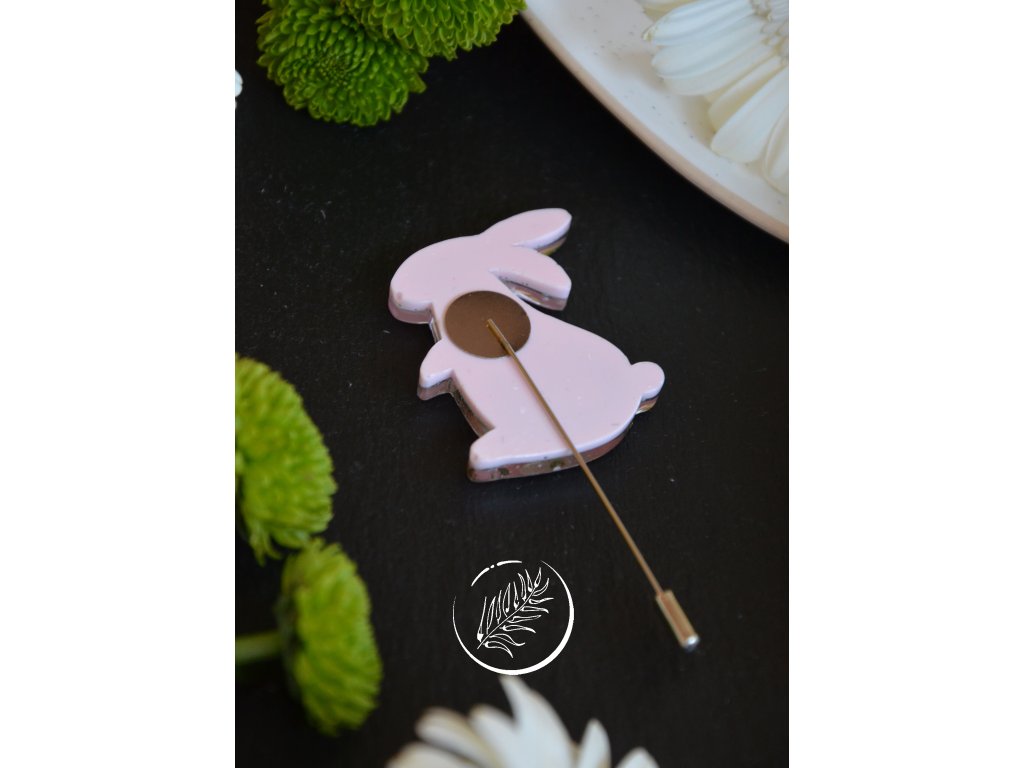 Světle růžová brož ve tvaru zajíčka s pravými sněženkami. Jehlicový mechanismus zapínání.