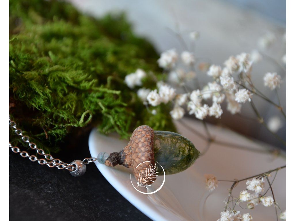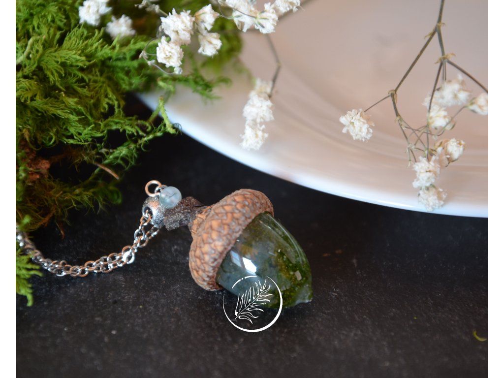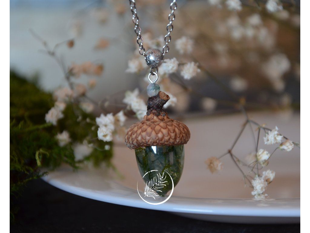 Náhrdelník ve tvaru žaludu s pravou žaludovou čepičkou, ve kterém je v mléčně bílé pryskyřici zalitý mech. Žalud je doplněný o drobný korálek z mechového achátu. Veškeré komponenty jsou z chirurgické oceli, délka řetízku 60 cm.