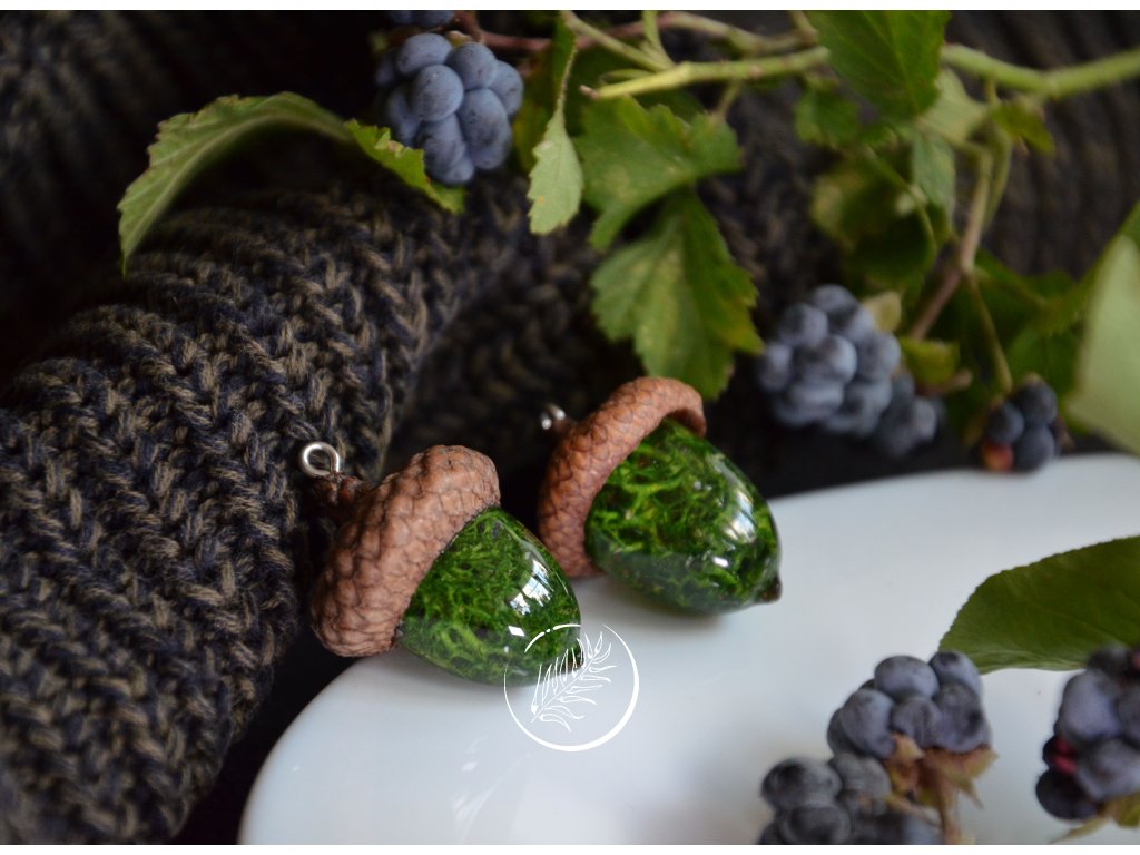 Přívěsek ve tvaru žaludu s tmavě zeleným lišejníkem dutohlávkou (Cladonia) a pravou žaludovou čepičkou. Veškeré komponenty jsou z chirurgické oceli.