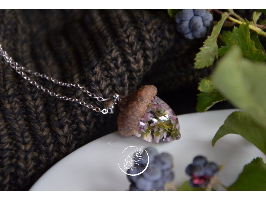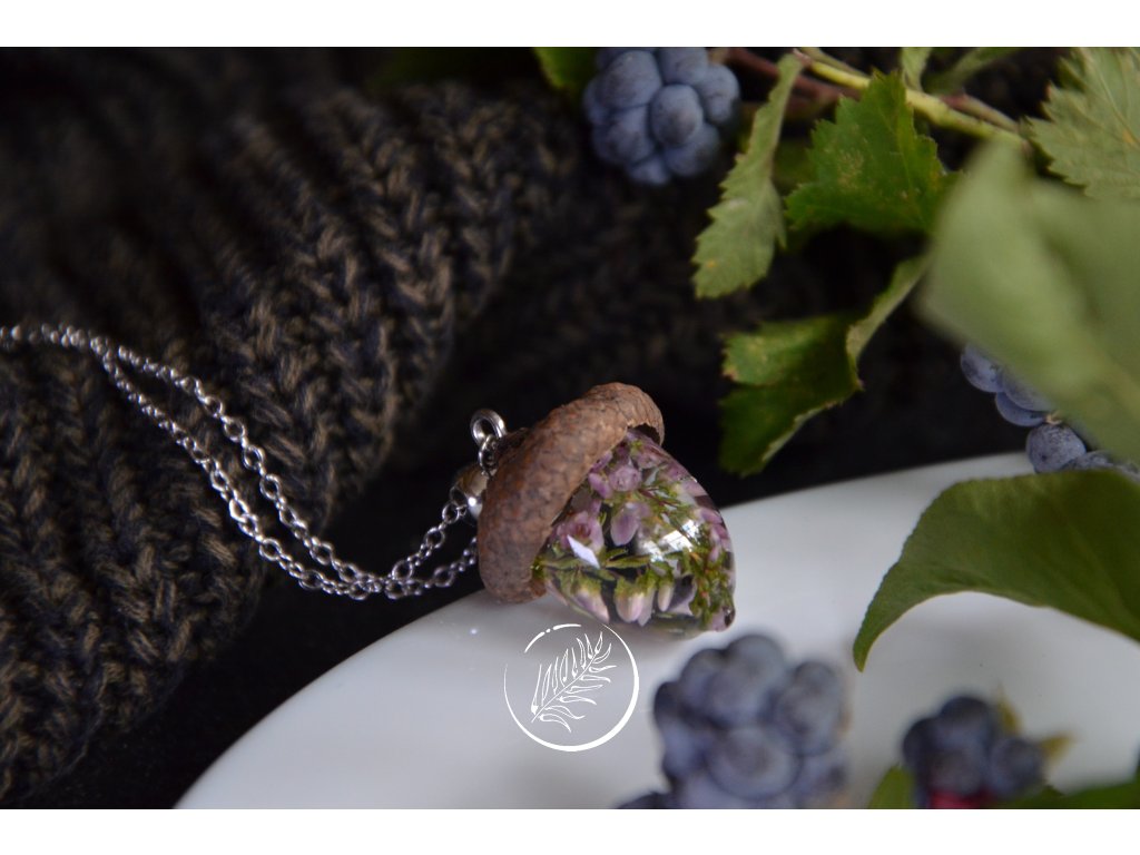 Přívěsek ve tvaru žaludu s vřesem a pravou žaludovou čepičkou. Veškeré komponenty jsou z chirurgické oceli.