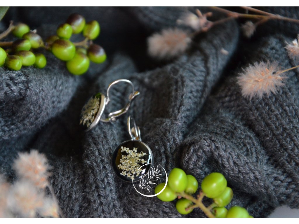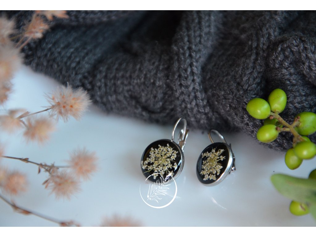 Visací náušnice s bílým květem kerblíku na černém pozadí. Velikost lůžka 10 mm. Zapínací mechanismus.