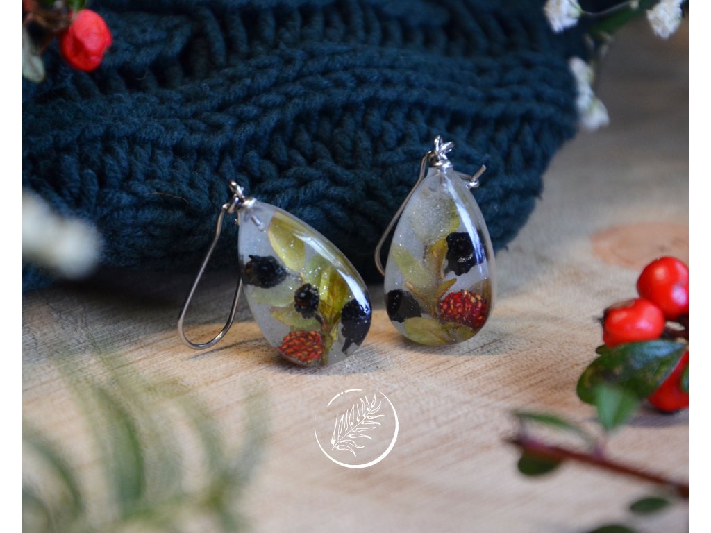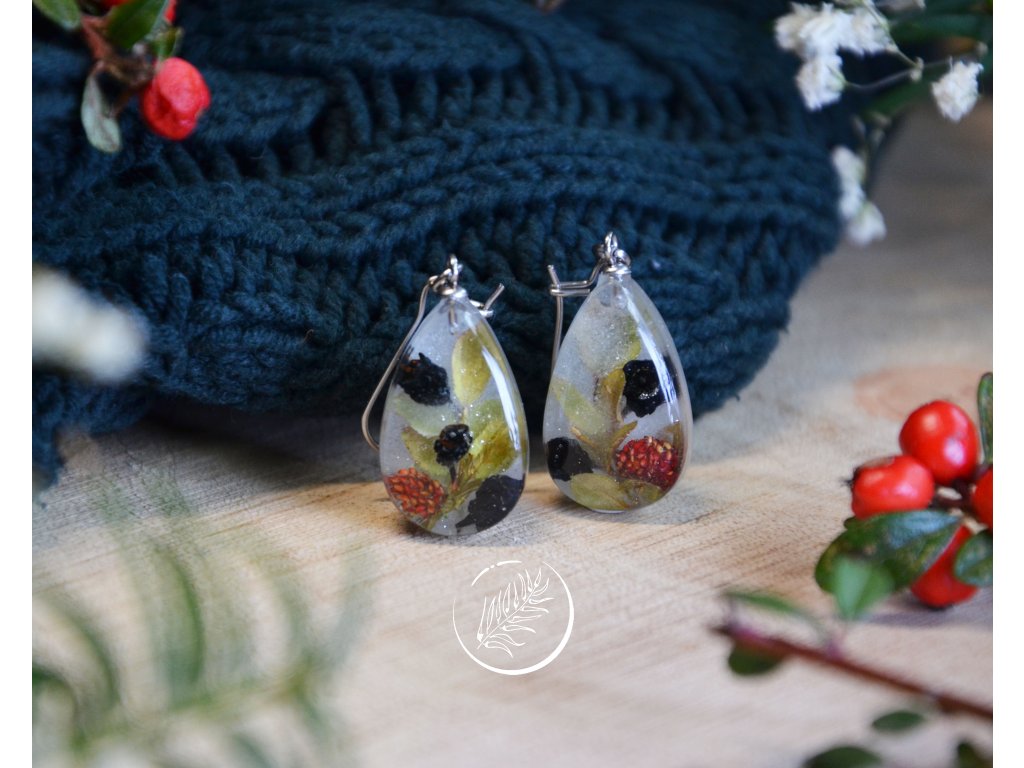 Náušnice ve tvaru kapky s lesní jahodou a borůvkami na třpytivém zasněženém pozadí. Veškeré komponenty jsou z chirurgické oceli.